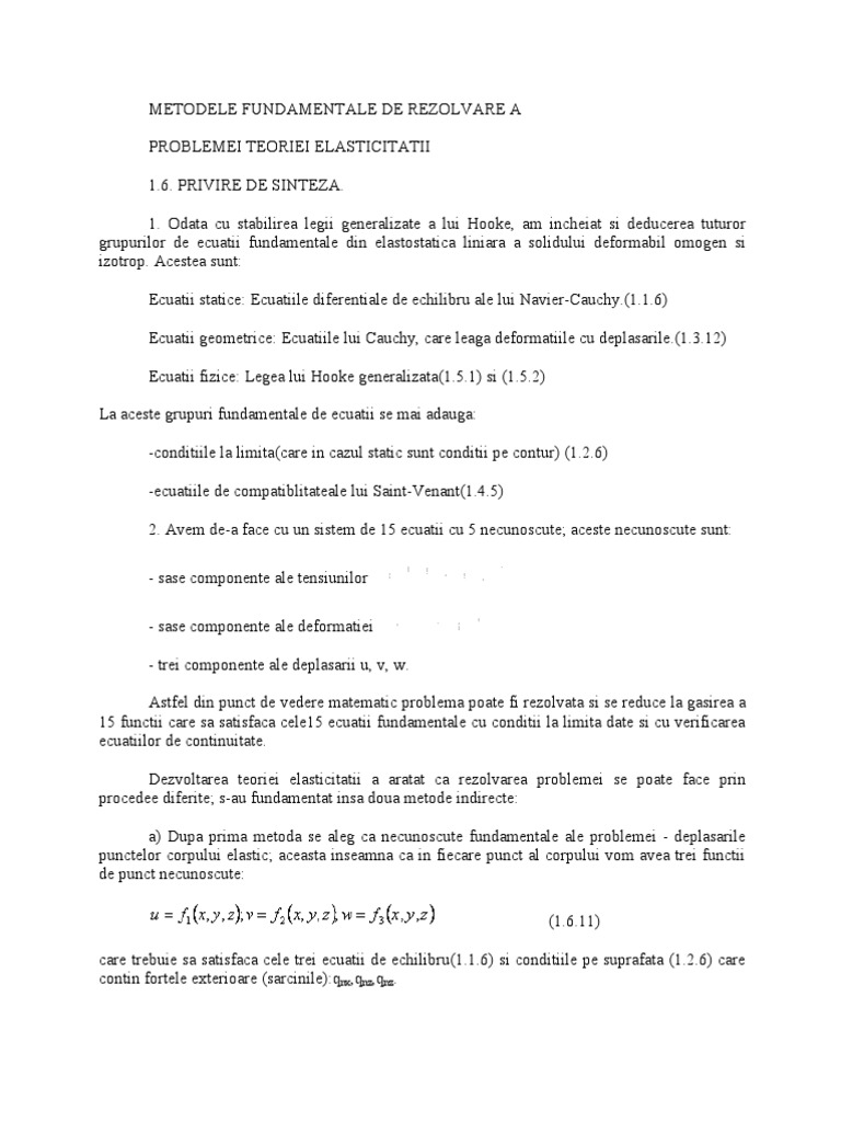 1. In aplicatiile practice de cele mai multe ori cunoastem sarcinile exterioare ce actioneaza pe contur; in fiecare punct de pe contur va trebui sa existe un echilibru mecanic intre tensiunile interioare si sarcinile exterioare (de componente ; le-am mai notat, pentru preciza ca este vorba de elemente de arie de la suprafata corpului cu , fiind normala [Link] trebui deci sa punem conditia ca pe contur tensiuniile obtinute dincalcul sa fie egale cu sarcinile exterioare date folosind relatiile (1.2.6) sau relatii de tipul (1.3.1) care se refera la directiile principale. Daca reusim sa integram sistemul de ecuatiiconsiderat mai sus, indeplinind si conditiile pe contur, am determinat in intregime starea de solicitare a corpului, problema elasticitatii fiind complet rezolvata. Problea de mai sus in care se pun conditii in tensiuni pe contur se numeste " prima problema fundamentala a teoriei elasticitatii". 2. Sa presupunem deci ca ne alegem canecunoscute fundamentale cele sase tensiuni; .In acest caz cele trei ecuatii de echilibru (1.1.6)nu sunt suficiente pentru rezolvarea problemei; le vom atasa si ecuatiile de continuitate(1.4.5). Problema se reduce astfel la integrarea a noua ecuatii cu sase functii necunoscute. Functiile arbitrare care rezulta prin integrare se vor determina din conditiile la limita (1.2.6). deoarece conditiile de compatibilitate (1.4.5) leaga intre