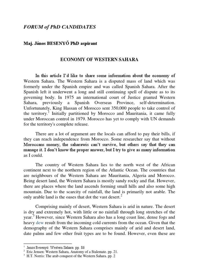 ECONOMY OF WESTERN SAHARA In this article Id like to share some information about the economy of Western Sahara. The Western Sahara is a disputed mass of land which was formerly under the Spanish empire and was called Spanish Sahara. After the Spanish left it underwent a long and still continuing spell of dispute as to its governing body. In 1975 an international court of Justice granted Western Sahara, previously a Spanish Overseas Province, self-determination. Unfortunately, King Hassan of Morocco sent 350,000 people to take control of the territory.1 Initially partitioned by Morocco and Mauritania, it came fully under Moroccan control in 1979. Morocco has yet to comply with UN demands for the territory's complete release. There are a lot of argument are the locals can afford to pay their bills, if they can reach independence from Morocco. Some researcher say that without Moroccans money, the saharawis cant survive, but others say that they can manage it. I dont know the proper answer, but I try to give as many information as I could. The country of Western Sahara lies to the north west of the African continent next to the northern region of the Atlantic Ocean. The countries that are neighbours of the Western Sahara are Mauritania, Algeria and Morocco. Being desert land, the Western Sahara is mostly sandy rocky and flat. However, there are places where the land ascends forming small hills and also some high mountain. Due to the scarcity of rainfall, the land is primarily not arable. The only arable land is the oases that dot the vast desert.2 Comprising mainly of desert, Western Sahara is arid in nature. The desert is dry and extremely hot, with little or no rainfall through long stretches of the year.3 However, since Western Sahara also has a long coast line, dense fogs and heavy dew result from the incoming cold currents from the ocean. Given that the demography of the Western Sahara comprises mainly of arid and desert land, date palms and few other fruit types are to be found. However, even these are