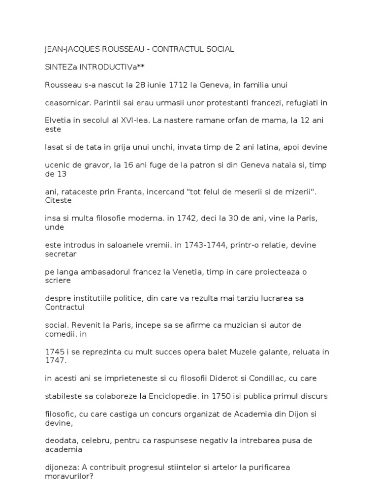 egalitatea ar consta in faptul ca puterea politica ar fi exercitata de fiecare potrivit rangului politic detinut si fara violenta, iar economic - in faptul ca fiecare ar fi un mic proprietar. Totodata, contractul rousseauist distingea intre suveran, termen prin care era numit poporul ca putere legislativa, si principe, care reprezenta guvernamantul ca putere executiva, insarcinata de popor cu administrarea legilor. in ce priveste formele de guvernamant, Rousseau a relevat, in raport de conditiile concrete, atat avantajele, cat si limitele comportate de monarhie, aristocratie si democratie, el insusi optand pentru o guvernare reprezentativa, in care guvernorii sa fie alesi si in functie de cultura si merite personale. Contractualismul rousseauist a inspirat revolutia franceza de la 1789 si a condus la realizarea statului de drept, bazat pe relatii de proprietate privata, dar nu si pe egalitate materiala, pentru ca proprietatea privata genereaza, prin chiar natura si functionarea ei, diferentieri economice. Rousseau ramane actual si prin ideea crizei culturii si solutia unei redresari culturale. * Capitolul VI DESPRE PACTUL SOCIAL Presupun ca oamenii au ajuns in stadiul cand obstacolele care impiedica ramanerea lor in starea de natura trag mai mult in cumpana, prin rezistenta lor, decat fortele pe care fiecare individ le poate