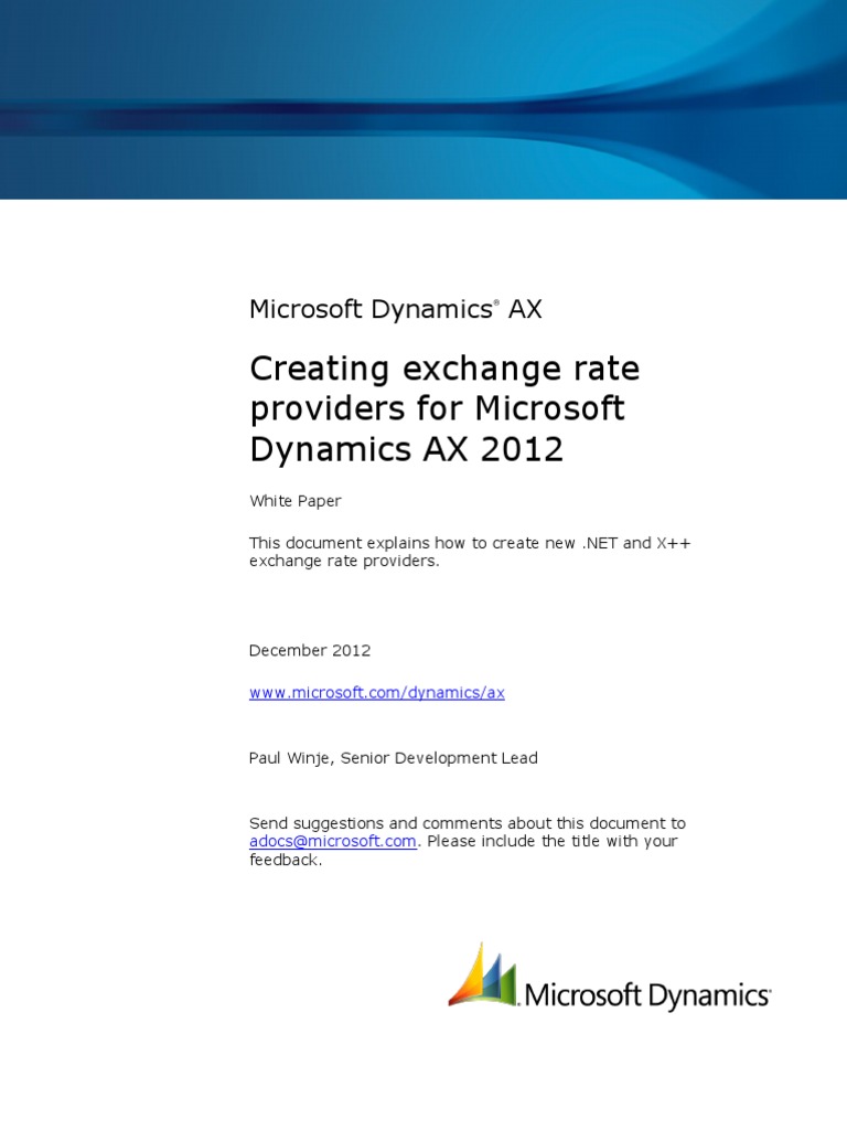 Before you begin ......................................................................................... 3 Terminology ................................................................................................ 3 Conceptual/Class model ............................................................................. 4 Introduction ................................................................................................ 5 Writing an exchange rate provider for X++ ................................................ 5 Writing an exchange rate provider for .NET .............................................. 10 Some innovative ideas to consider ............................................................ 18