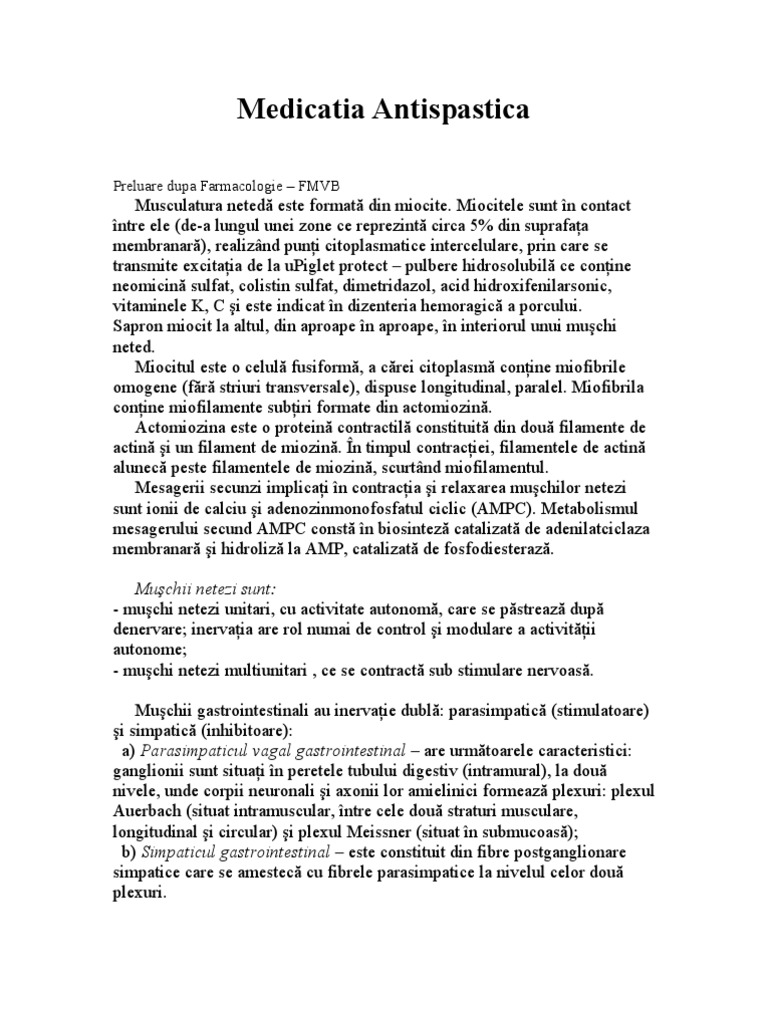 De la nivelul celor dou plexuri pornesc fascicule de fibre postganglionare ctre miocite. Neuromediatorii chimici acetilcolina i noradrenalina sunt eliberai de terminaiile nervoase n spaiul intercelular. Spasmul reprezint contractura de tip spastic a muchilor netezi. Ca ageni spastici pot aciona factori fizici, chimici, inflamaii, tumori. Locul aciunii agenilor spastici poate fi muchiul neted digestiv, mucoasa digestiv, alte esuturi la distan. Spasmele sunt nsoite de durere, tulburri motorii i secretorii. Spasmele intense pot genera colici gastrointestinale i abdominale. Aciunea antispastic reprezint profilaxia (prevenirea) spasmului. Aciunea spasmolitic reprezint tratarea (nlturarea) spasmului. Medicamentele spasmolitice nltur contractura muscular spastic i durerea ce o nsoete, producnd relaxare muscular. Aceste medicamente pot fi clasificate n funcie de tipul de mecanism n: neurotrope, anticolinergice antimuscarinice (parasimpaticolitice), de tip atropinic, ganglioplegice, miotrope de tip papaverinic. a) Antispastice neurotrope parasimpaticolitice - naturale: atropina; - de sintez: butilscopolamoniu, propantelina, metantelina, oxifenoniu, oxifenciclimina, fenpipramida, otilonium, clidinium, oxibutinin, tolterodina, propiverina. b) Antispastice miotrope - naturale: papaverina; - de sintez: mebeverina, drotaverina, pitofenona, noraminofenazona (metamizol). n funcie de teritoriul predominant de aciune, antispasticele neurotrope parasimpaticolitice pot fi: - antispastice digestive: atropina, butilscopolamoniu, propantelina, metantelina, oxifenoniu, oxifenciclimina, fenpipramida, otilonium, clidinium; - antispastice urinare: emepronium, oxibutinin, tolterodina, propiverina. Alte subgrupe farmacodinamice cu mecanism de aciune relaxant miotrop: - antiastmatice bronhodilatatoare miotrope: teofilina, ipratropium, tiotropium; - antianginoase coronarodilatatoare miotrope: nitriii.
