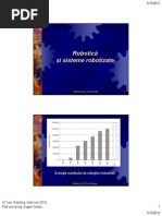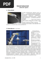 Robotica este un domeniu al stiintei si al tehnicii relatic nou, cu o rapida dezvoltare, legat de ralizarea si folosirea robotilor si a sistemelor tehnica. Robotica a aparut ca ramura stiintifica de sine statatoare, pe baza mecanicii si ciberneticii, actualmente a mecatronicii. In acelasi timp, dezvoltarea roboticii a ridicat problem stiintifice noi intr-un sir de stinte conexe, conducand la progresul acestora. Robotul, ca obiect de baza in aceasta stiinta, poate fi definit ca un automat universal pentru reproducerea unor functii de miscare si intelectuale ale omului. Exista o serie de categorii de roboti ce dezvolta unul sau altul din domeniile si subdomeniile functiilor de mai sus. Dintre acesti roboti se desprinde o clasa importanta si anume aceea a robotilor de manipulare. Caracteristica robotilor de manipulare, din care clasa fac parte si robotii industriali, existent elementului periferic: dispozitivl de pretensiune(apucare). Scopul practice al introducerii robotilor este Acela al incarcarii lor cu acele tipuri de actiuni care pentru om sunt dificile, prezinta sarcini gravitationale mari, sunt monotone,periculoase pentru sanatate si viata. Adica, in primul rand, la operatiile de productie auxiliare: incarcarea si descarcarea masinilor unelte si a automatelor si la operatii de prelucrare propriu-zisa cu robotii industriali: sudura, vopsire, debitare, montaj, etc. utilizarea robotilor cuprinde si domeniul conditiilor de lucru asa zis extreme: sub apa, in cosmos, in medii radioactive sau otravitoare. 1) Structura mecanica a robotilor industriali Structura mecanica a robotilor industriali este formata din elemente(ce pot fi considerate rigide) si cuple cinematice ce realizeaza legarea elemntelor intre ele si a primului element la batiu. Dintre clasele de cuple cinematice se utilizeaza, in primul rand, cuple C5 cu un singur grad de mobilitate, adica numai cuple de rotatie (R) si de translatie (T). cuplele superioare C4 si C3 ridica atat problem tehnologice privind prelucarea jocurilor, cat si dificultati de actionare. Vom considera, in continuare, structure la care elementele sunt legate prin cuple inferioare. Structurile pot fi de tip lant cinematic deschis sau lant cinematic inchis. In cazul lantului cinematic deschis elemntele si cuplele formeaza o structura arborescenta( in sensul teoriei grafurilor) atunci cand cuplele conecteaza numai doua elemente din succesiunea lor ordinal. O caracteristica a structurilor cu lant cinematic deschis este aceea ca numarul de grade de libertate este egal cu cel al cuplelor sau, altfel spus, fiecare cupla este motoare.