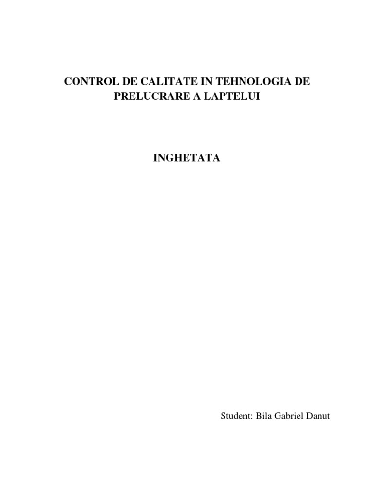 ANALIZA I CONTROLUL CALITII NGHEATEI Controlul calitii ngheatei implic: control microbiologic, verificarea ambalrii i marcrii, examenul organoleptic, analiza chimic. Examenul organoleptic: pentru examenul organoleptic se recolteaza cu sonda probe medii reprezentative din inghetata si se apreciaza: Structura si consistent la -10 C Gustul si mirosul la -5C Caracteristicile organoleptice ale inghetatei: - Structura si consistent fina, omogena, fara cristale de gheata. - Aroma placuta, corespunzatoare aromei adaugate - Gust dulce sau acrisor, corespunzator substantelor de aroma utilizate. Analize fizico-chimice: Gradul de omogenizare Determinarea procentului de substanta uscata Determinarea aciditatii inghetatei Determinarea procentului de grasime Determinarea zaharozei Analize microbiologice: Se determina numarul total de germeni aerobici si mezofili si numarul de bacteria coliforme dupa metodele cunoscute.