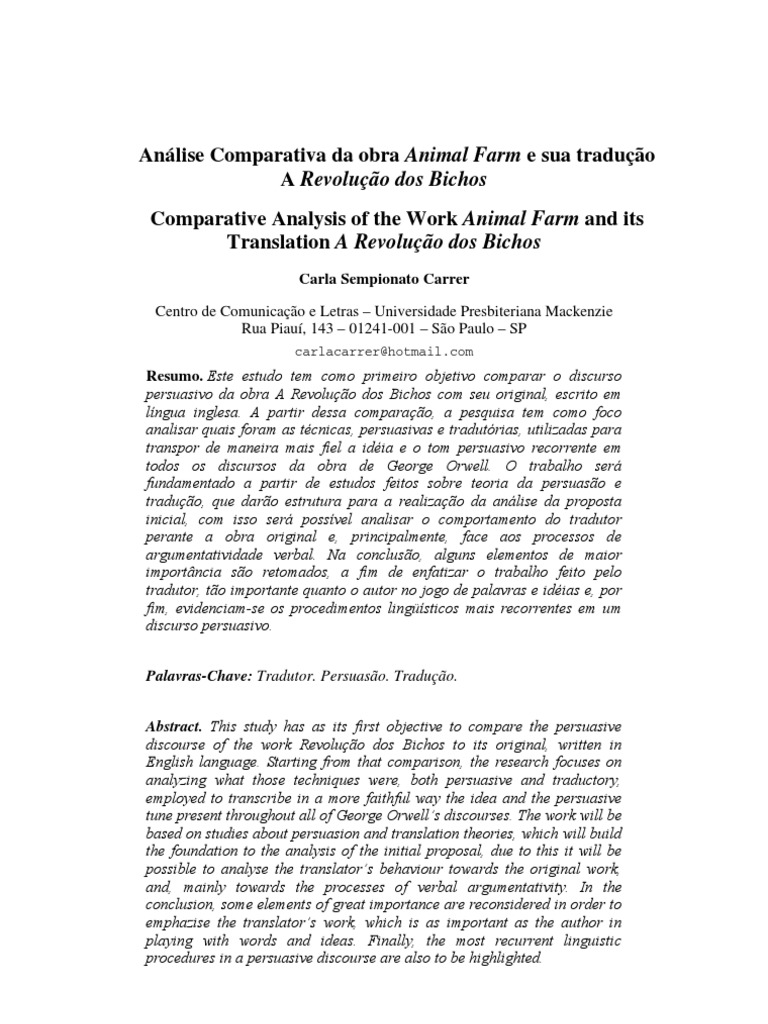 Resumo. Este estudo tem como primeiro objetivo comparar o discurso persuasivo da obra A Revoluo dos Bichos com seu original, escrito em lngua inglesa. A partir dessa comparao, a pesquisa tem como foco analisar quais foram as tcnicas, persuasivas e tradutrias, utilizadas para transpor de maneira mais fiel a idia e o tom persuasivo recorrente em todos os discursos da obra de George Orwell. O trabalho ser fundamentado a partir de estudos feitos sobre teoria da persuaso e traduo, que daro estrutura para a realizao da anlise da proposta inicial, com isso ser possvel analisar o comportamento do tradutor perante a obra original e, principalmente, face aos processos de argumentatividade verbal. Na concluso, alguns elementos de maior importncia so retomados, a fim de enfatizar o trabalho feito pelo tradutor, to importante quanto o autor no jogo de palavras e idias e, por fim, evidenciam-se os procedimentos lingsticos mais recorrentes em um discurso persuasivo. Palavras-Chave: Tradutor. Persuaso. Traduo. Abstract. This study has as its first objective to compare the persuasive discourse of the work Revoluo dos Bichos to its original, written in English language. Starting from that comparison, the research focuses on analyzing what those techniques were, both persuasive and traductory, employed to transcribe in a more faithful way the idea and the persuasive tune present throughout all of George Orwells discourses. The work will be based on studies about persuasion and translation theories, which will build the foundation to the analysis of the initial proposal, due to this it will be possible to analyse the translators behaviour towards the original work, and, mainly towards the processes of verbal argumentativity. In the conclusion, some elements of great importance are reconsidered in order to emphazise the translators work, which is as important as the author in playing with words and ideas. Finally, the most recurrent linguistic procedures in a persuasive discourse are also to be highlighted.