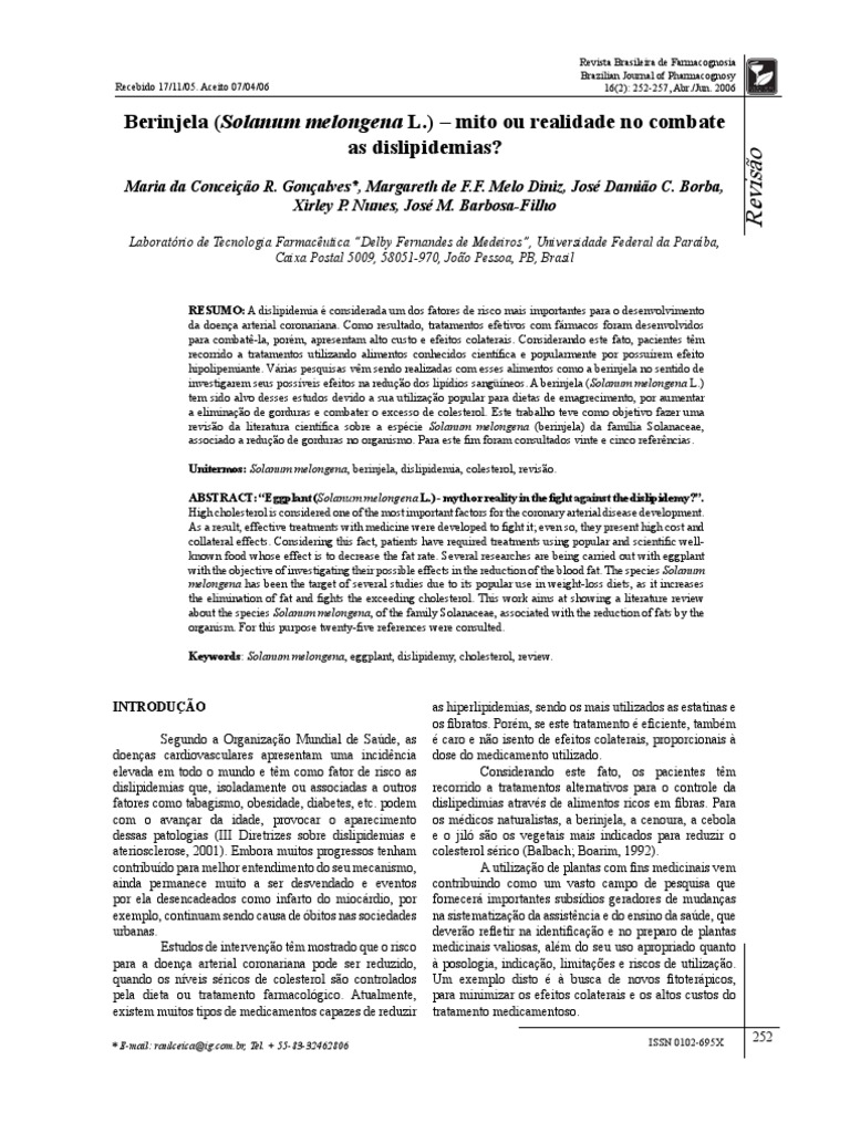 RESUMO: A dislipidemia considerada um dos fatores de risco mais importantes para o desenvolvimento da doena arterial coronariana. Como resultado, tratamentos efetivos com frmacos foram desenvolvidos para combat-la, porm, apresentam alto custo e efeitos colaterais. Considerando este fato, pacientes tm recorrido a tratamentos utilizando alimentos conhecidos cientca e popularmente por possurem efeito hipolipemiante. Vrias pesquisas vm sendo realizadas com esses alimentos como a berinjela no sentido de investigarem seus possveis efeitos na reduo dos lipdios sangneos. A berinjela (Solanum melongena L.) tem sido alvo desses estudos devido a sua utilizao popular para dietas de emagrecimento, por aumentar a eliminao de gorduras e combater o excesso de colesterol. Este trabalho teve como objetivo fazer uma reviso da literatura cientca sobre a espcie Solanum melongena (berinjela) da famlia Solanaceae, associado a reduo de gorduras no organismo. Para este m foram consultados vinte e cinco referncias. Unitermos: Solanum melongena, berinjela, dislipidemia, colesterol, reviso. ABSTRACT: Eggplant (Solanum melongena L.) - myth or reality in the ght against the dislipidemy?. High cholesterol is considered one of the most important factors for the coronary arterial disease development. As a result, effective treatments with medicine were developed to ght it; even so, they present high cost and collateral effects. Considering this fact, patients have required treatments using popular and scientic wellknown food whose effect is to decrease the fat rate. Several researches are being carried out with eggplant with the objective of investigating their possible effects in the reduction of the blood fat. The species Solanum melongena has been the target of several studies due to its popular use in weight-loss diets, as it increases the elimination of fat and ghts the exceeding cholesterol. This work aims at showing a literature review about the species Solanum melongena, of the family Solanaceae, associated with the reduction of fats by the organism. For this purpose twenty-ve references were consulted. Keywords: Solanum melongena, eggplant, dislipidemy, cholesterol, review.
