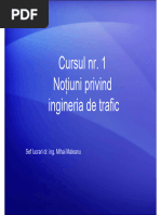 4.1.2. Nevoile utilizatorilor sistemului trafic rutier Aa cum se cunoate, sistemul traficului rutier cuprinde patru elemente omul, vehiculul, drumul i mediul nconjurtor. Acest sistem este, n mod natural, un sistem instabil i poate fi meninut n echilibru numai prin intervenia frecvent a omului (de obicei conductor auto dar, n egal msur, pieton sau biciclist). O sarcin important pentru inginerii de trafic este cunoaterea performanelor umane, a abilitilor i a caracteristicilor comportamentale care reprezint elementele de intrare n sistemul traficului rutier. Pentru a influena comportamentul uman, inginerii de trafic trebuie s ia n considerare diversitatea metodelor de control al traficului rutier. De exemplu, semnele i semnalele de trafic se dovedesc inutile dac conductorii auto nu le vd, nu le interpreteaz, nu rspund sau nu se conformeaz lor. Operarea n siguran a sistemului traficului rutier depinde, n consecin, de utilizatorii drumului - conductori auto, pietoni i bicicliti care genereaz o serie de decizii secveniale corecte sau, chiar incorecte, dar care trebuie s fie implementate ntr-un mediu tolerant. Inginerii de trafic i inginerii constructori de drumuri au un rol esenial n asistarea utilizatorilor drumului pentru a aciona corect, att prin controlul situaiilor critice pe care acetia sunt capabili s le rezolve, ct i prin prezentarea informaiei n aa fel nct s favorizeze luarea deciziei n mod rapid i corect. Elementele de ingineria traficului, cum ar fi semnele, semnalele i marcajele de circulaie, au rolul de a ajuta utilizatorii drumului s se deplaseze n siguran. Aprecierea performanelor conductorului auto - ca parte a sistemului traficului rutier - este esenial pentru proiectarea i operarea efectiv a drumului. Atunci cnd proiectarea este incompatibil cu performanele umane (att conductori ct i orice alt utilizator al drumului), ansa apariiei erorilor i accidentelor rutiere crete. Studierea factorului uman presupune investigarea abilitilor i caracteristicilor fizice, senzoriale (perceptuale) i cognitive, precum i a modului n care acestea interacioneaz cu echipamentele, vehiculele i mediul nconjurtor. Analiza factorului uman n transportul rutier urmrete: Explicarea nevoilor de informare, caracteristicile i abilitile utilizatorilor drumului. Studierea interaciunilor sistemului om vehicul drum mediu. mbuntirea sistemului traficului rutier pe baza cunotinelor acumulate. Aplicarea principiilor factorului uman n problemele de siguran i eficien rutier necesit o abordare ce este orientat pe sistem ca ntreg, dar n acelai timp este centrat pe elementul uman. Abordarea orientat pe sistem recunoate interaciunea om vehicul - drum mediu, care accept c nici unul dintre elemente nu poate fi analizat i neles dac este considerat izolat. Utilizatorul drumului este considerat elementul operativ din cadrul sistemului n abordarea centrat pe factorul uman, dar i responsabil al consecinelor deciziilor luate, iniiativa inginereasc fiind focalizat pe optimizarea performanelor acestuia. Analiza factorului uman, considerat n strns legtur cu toate celelalte elemente ale sistemului, conduce la stabilirea cerinelor atribuite inginerului de trafic: S se asigure c utilizatorii drumului vor avea sarcini ce corespund posibilitilor lor de a aciona pentru o palet larg de situaii.