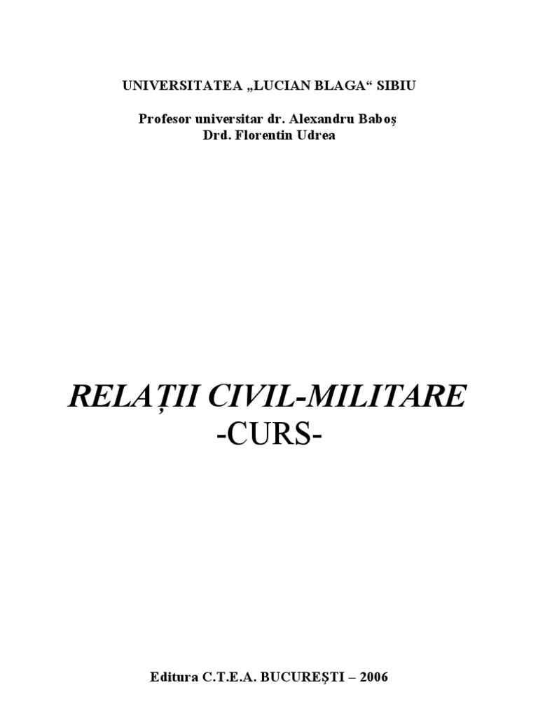 condiie esenial n asigurarea propriei securiti, de promovarea i protejarea intereselor naionale i a valorilor universale recunoscute, de afirmarea principiilor democraiei. Principalele riscuri i ameninri la adresa securitii Romniei i a aliailor si sunt reprezentate de terorism, crima organizat i proliferarea armelor de distrugere n mas, precum i de existena unor regimuri nedemocratice sau instabile n plan regional. Securitatea naional a Romniei este asigurat mult mai eficient, prin participarea la operaii chiar departe de graniele naionale. Acest paradox, aparent, reprezint o realitate determinat de schimbrile care se produc n lume din cauza fenomenelor generate de globalizare, incluznd aici i globalizarea riscurilor i ameninrilor la adresa securitii. Un eveniment care se produce departe de granie poate s afecteze securitatea naional a unui stat. Lupta mpotriva terorismului presupune angajarea n astfel de teatre de operaii, departe de ar, fr un contact preexistent din perspectiv politic sau cultural. Evenimentele internaionale recente, care au implicat operaii militare, indiferent de locul, durata sau intensitatea violenei, au scos n eviden o cretere important a necesitii coordonrii activitilor militare att cu activitile autoritilor administraiei publice centrale (locale), ct i cu cele ale organizaiilor internaionale, neguvernamentale i private de voluntari. Instituionalizarea relaiilor civil-militare i a modului de manifestare a acestora, n formele cunoscute, este mai mult dect necesar n statele democratice. Prezentul curs se adreseaz studenilor, masteranzilor, cadrelor didactice a cror preocupare o reprezint i studierea fenomenului militar, a relaiilor care apar i se dezvolt ntre civili i militari.