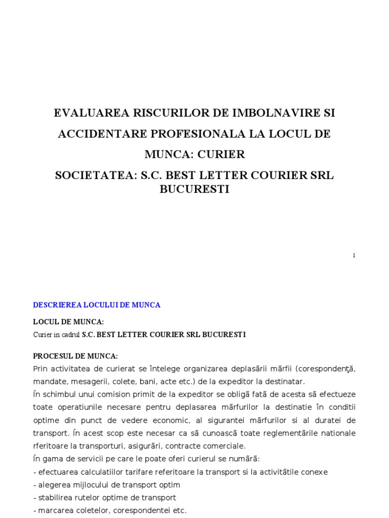 EVALUAREA RISCURILOR DE IMBOLNAVIRE SI ACCIDENTARE PROFESIONALA LA LOCUL DE MUNCA: CURIER SOCIETATEA: S.C.