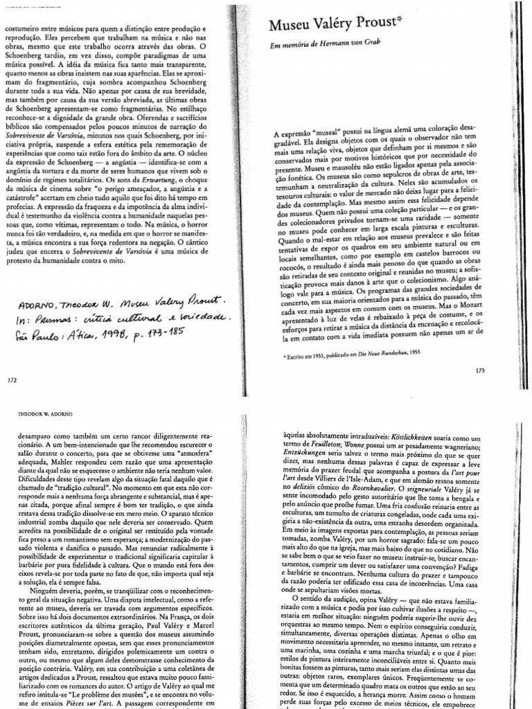 desamparo como tambem um certo rancor diligentemente reacionario. A um bem-intencionado que the recomendou escurecer a satio durante a concerto, para que se obtivesse uma "atmosfera" adequada, Mahler respondeu com razao que uma apresenta~ao diante da qual nao se esquecesse a ambiente nao teria nenhum valor. Dificuldades desse tipo revelam alga da situa~ao fatal daquilo que e chamado de "tradi~ao cultural". No momenta em que esta nao corresponde mais a nenhuma for~a abrangente e substancial, mas e apenas citada, porque afinal sempre e bom ter tradi~ao, a que ainda restava dessa tradi~ao dissolve-se em mero meio. 0 aparato tecnico industrial zomba daquilo que nele deveria ser conservado. Quem acredita na possibilidade de 0 original ser restitufdo pela vontade fica preso a um romantismo sem esperari~a; a moderniza~ao do passado violenta e danifica 0 passado. Mas renunciar radicalmente a possibilidade de experimentar a tradicional significaria capitular a barbarie por pura fidelidade a cultura. Que a mundo esta fora dos eixos revela-se par toda parte no fato de que, nao importa qual seja a solu~ao, ela e sempre falsa. Ninguem deveria, porem, se tranqiiilizar com 0 reconhecimento geral da situa~ao negativa. Uma disputa intelectual, como a referente ao museu, deveria ser travada com argumentos espedficos. Sobre isso ha dais documentos extraordinarios. Na Fran~a, as dais escritores autenticos da ultima gera~ao, Paul Valery e Marcel Proust, pronunciaram-se sabre a questao dos museus assumindo posi~oes diametralmente opostas, sem que esses pronunciamentos tenham sido, entretanto, dirigidos polemicamente um contra 0 outro, ou mesmo que algum deles demonstrasse conhecimento da posi~ao contra.ria. Valery, em sua contribui~ao a uma coletanea de artigos dedicados a Proust, ressaltou que estava muito pouco familiarizado com as romances do autor. 0 artigo de Valery ao qual me refiro intitula-se "Le probleme des musees", e se encontra no volume de ensaios Pieces sur ['art. A passagem correspondente em Proust encontra-se no terceiro volume de A l'ombre des jeunes filles en fleurs. plaidoyer de Valery refere-se evidentemente ao desconcertante excesso de obras de arte no Louvre. Ele declara nao gostar muito de museus. Haveria muitas obras admiraveis, mas poucas deHcias. A palavra utilizada por Valery, delices, pertence, diga-se de passagem,