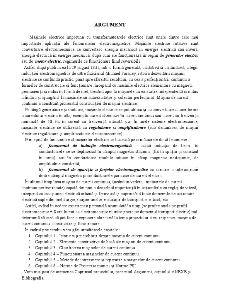 Mainele electrice mpreuna cu transformatoarele electrice sunt unele dintre cele mai importante aplicaii ale fenomenelor electromagnetice. Mainile electrice rotative sunt convertoare electromecanice ce convertesc energia mecanic n energie electric sau invers, energia electric n energie mecanic, dup cum ele funcioneaz n regim de generator electric sau de motor electric, regimurile de funcionare fiind reversibile. Astfel, dup publicarea la 29 august 1831, intr-o form general, calitativ si cantinativ, a legii induciei electromagnetice de ctre fizicianul Michael Faradey, istoria dezvoltrii mainii electrice se confund practic, pan spre sfaritul secolului, cu cea a perfec ionrii continuu a formelor de construcie i funcionare .Incepnd cu masinile electrice elementare cu magnei permaneni si indus n form de inel, trecnd apoi la mainele cu excitaie independent si indus cilindric i ajungnd la mainele cu autoexcita ie i colector perfec inat .Maina de curent continuu a constituit pioneratul construciei de maini electrice. Pe lng generatoare i motoare, mainile electrice se pot utiliza i ca convertoare a unei forme a curentului electric n alta, exemplu curent alternativ n curent continuu sau curent cu frecvena nominal de 50 Hz n curent cu frecven ridicat .a. n unele sisteme electromecanice, mainile electrice se utilizeaz ca regulatoare i amplificatoare (sub denumirea de maini electrice regulatoare i amplificatoare electromecanice). Principiul de funcionare al mainilor electrice se bazeaz pe urmtoarele dou fenomene: a) fenomenul de inducie electromagnetic adic inducia de t.e.m. n conductoarele ce se deplaseaz n cmpul magnetic staionar (fix n spaiu i constant n timp) sau n conductoare imobile situate n cmp magnetic nestaionar, de amplitudine constant; b) fenomenul de apari ie a forelor electromagnetice ca urmare a interaciunii dintre cmpul magnetic i conductoarele parcurse de curent electric. n ultimul timp nsa maina de curent continuu, (avnd in vedere, motoarele de curent continuu perfecionate) capat din nou o deosebit importan n acionrile cu reglaj de vitez, incepand cu traciunea electric urban i feroviar i cuprinznd toate domeniile de acionare electric suple din metalurgie, maini unelte, instala ii de transport si ridicat, etc. Astfel, avnd n vedere experiena personal acumulat n timp ([Link] pe profil electromecanic + 8 ani lucrat ca electromecanic in intreinere pe domeniul transport electric) m determin s cred c pot face o expunere obiectiv la tema proiectului ales, respectiv: maina de curent continuu-construcie i funcionare-. n cadrul proiectului vom gsi urmtoarele capitole : 1. Capitolul 1 - Istoric si generalitai despre maina de curent continuu 2. Capitolul 2 - Elemente constructive de baz ale mainii de curent continuu 3. Capitolul 3 - Clasificarea mainelor de curent continuu 4. Capitolul 4 Funcionarea mainelor de curent continuu 5. Capitolul 5 Metode de intreinere i reparaie a mainelor de curent continuu 6. Capitolul 6 Norme de Protecia muncii i Norme PSI Vom mai gasi de asemenea Cuprinsul proiectului, prezentul Argument, capitolul ANEXE i Bibliografia.