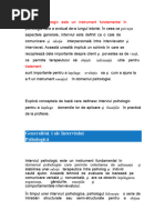 mai important mod de colectare a datelor din timpul evaluarii psihologice. El este endemic in indeplinirea sarcinilor celor mai multi psihologi, in special a consultantilor. O cautare pe calculator, folosind cuvintele cheie, ca interviu clinic, evaluare a interviului si interviu initial, pentru ultimii 20 de ani au relevant 1.260 citari, sau 63 pe an. Cu siguranta, intervievarea continua sa fie un proces important, care continua sa preocupe, atat pe cei ce lucreaza in clinici, cat si cercetatorii. Acest capitol discuta despre problemele actuale in evaluarea psihopatologica si a pesonalitatii prin interviuri. Discutam despre tipuri de interviuri, despre felul in clientii si cei care lucreaza in clinici abordeaza un interviu, si interviuri structurate versus interviuri nestructurate. Structura interviului este prezentata impreuna cu preocupari continue legate de sistemele oficiale de diagnosticare. Se discuta problemele care complica procesul de evaluare a tulburarilor de personalitate, incluzand problema ratei de baza, rolul tulburarilor afective, versus evaluarea trasaturilor, rolul culturii, fiabilitatea diagnosticului psihiatric, diagnostic suprapus si comorbiditati. Descoperirile actuale a fiabilitatii interviurilor clinice structurate sunt prezentate. Capitolul se incheie cu o discutie despre diagnosticul asistat de calculator si sugestii pentru viitor. ISTORIA INTERVIEVARII Diagnosticare are o istorie lunga. De fapt, starile pe care noi le etichetam acum ca fiind depresie si isterie apar atat in literatura sumeriana si egipteana din anii 2.400 i.H.. Incercarile initiale de clasificare psihiatrica formala au inceput in anul 1840 si au grupat toate tulburarile in doua categorii: idiotic si nebun. In anul 1880 erau doar 7 diagnostice psihiatrice existente: dementa, alcoolismul, epilepsia, mania, melancholia, depresia si pareza. Acum exista sute de diagnostice in Manualul Statistic si de Diagnoza a Tulburarilor Mentale- editia a patra. Cititorii interesati in istoria diagnosticarii psihiatrice fac referire la cateva recenzii excelente despre aceasta in alta parte (Menninger, Mayam & Pruyser, 1963, o carte de 70 de pagini cu istorie diagnosticarii psihiatrice din anul 2.600 i.H., pana in 1963; Zilboorg, 1941) si la cateva revizii ale DSM. Cuvantul interviu a fost inclus initatila in dictionarele standard in 1514si desemna o intalnire a persoanelor fata in fata cu scopul unei conferinte formale intr-un anumit punct (Matarazzo, 1965). Interviurile initiale de evaluare erau modelate pe formatul intrebare-raspuns. Introducerea psihoanalizei a permis un format mai amplu, cu o fluenta mai mare. De-a lungul anilor 1940 si 1950, cercetatorii au inceput sa studieze interviurile in termenii continuturilor lor versus procesul in sine, rezolvarea problemei versus elemente expressive, gradul de directitate din timpul interviului, cantitatea structurii si activitatea atat a celui care raspunde, cat si a intervievatorului. Carl Rogers a stimulat multe cercetari in anii 60 subliniind calitatile personale ale clinicianului (de exemplu: caldura, acuratetea empatiei, punct de vedere pozitiv neconditionat, autenticitate). Anii 70 au introdus idea folosirii interviurilor de diagnosticare structurate si au rezultat progrese in evaluarea comportamentala, interviurile fiind mai specifice si