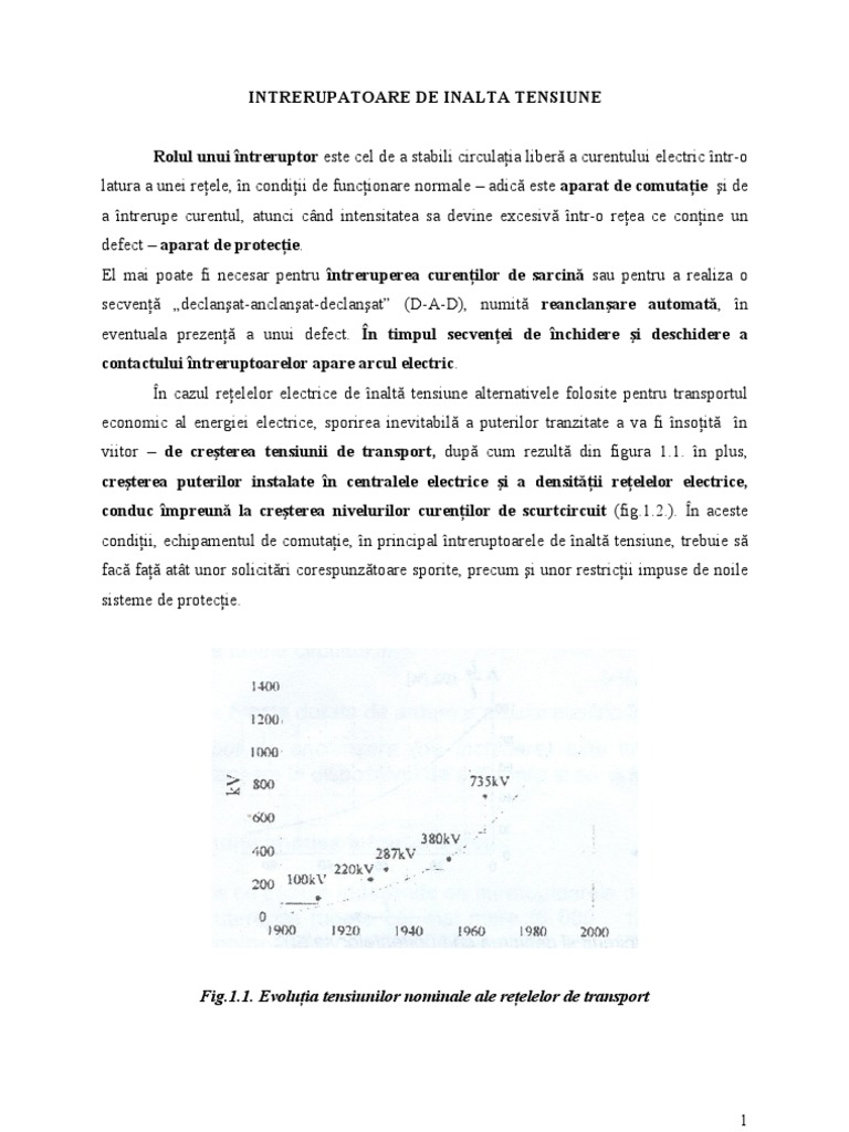 a unei reele, n condiii de funcionare normale adic este aparat de comutaie i de a ntrerupe curentul, atunci cnd intensitatea sa devine excesiv ntr-o reea ce conine un defect aparat de protecie. El mai poate fi necesar pentru ntreruperea curenilor de sarcin sau pentru a realiza o secven declanat-anclanat-declanat (D-A-D), numit reanclanare automat, n eventuala prezen a unui defect. n timpul secvenei de nchidere i deschidere a contactului ntreruptoarelor apare arcul electric. n cazul reelelor electrice de nalt tensiune alternativele folosite pentru transportul economic al energiei electrice, sporirea inevitabil a puterilor tranzitate a va fi nsoit n viitor de creterea tensiunii de transport, dup cum rezult din figura 1.1. n plus, creterea puterilor instalate n centralele electrice i a densitii reelelor electrice, conduc mpreun la creterea nivelurilor curenilor de scurtcircuit (fig.1.2.). n aceste condiii, echipamentul de comutaie, n principal ntreruptoarele de nalt tensiune, trebuie s fac fa att unor solicitri corespunztoare sporite, precum i unor restricii impuse de noile sisteme de protecie.