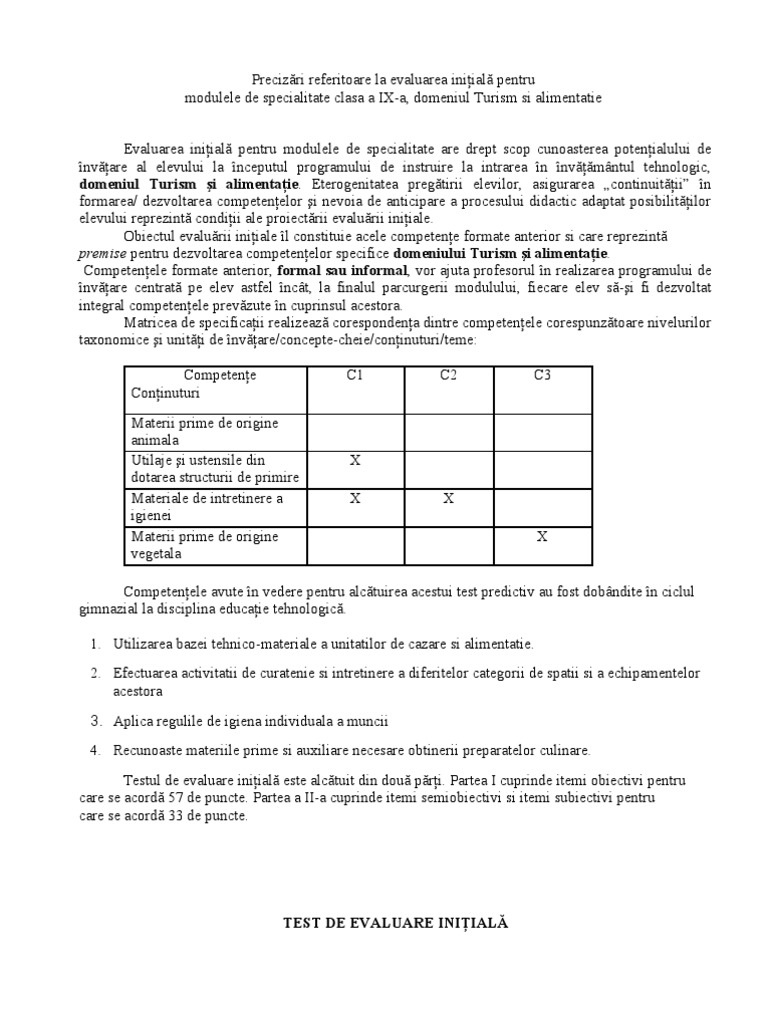 Competenele avute n vedere pentru alctuirea acestui test predictiv au fost dobndite n ciclul gimnazial la disciplina educaie tehnologic. 1. Utilizarea bazei tehnico-materiale a unitatilor de cazare si alimentatie. 2. Efectuarea activitatii de curatenie si intretinere a diferitelor categorii de spatii si a echipamentelor acestora 3. Aplica regulile de igiena individuala a muncii 4. Recunoaste materiile prime si auxiliare necesare obtinerii preparatelor culinare. Testul de evaluare iniial este alctuit din dou pri. Partea I cuprinde itemi obiectivi pentru care se acord 57 de puncte. Partea a II-a cuprinde itemi semiobiectivi si itemi subiectivi pentru care se acord 33 de puncte.