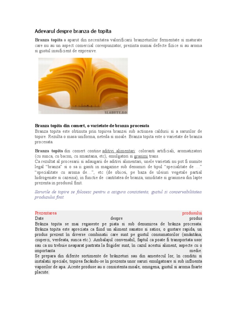 Branza topita din comert, o varietate de branza procesata Branza topita este obtinuta prin topirea branzei sub actiunea caldurii si a sarurilor de topire. Rezulta o masa uniforma, neteda si moale. Branza topita este o varietate de branza procesata. Branza topita din comert contine aditivi alimentari: coloranti artificiali, aromatizatori (cu sunca, cu bacon, cu smantana, etc), emulgatori si grasimi trans. Ca rezultat al procesarii si adaugarii de aditivi alimentari, unele varietati nu pot fi numite legal branza si o sa ii gasiti in magazine sub denumiri de tipul specialitate de specialitate cu aroma de, etc (de obicei, pe baza de uleiuri vegetale partial hidrogenate si cazeina), in functie de cantitatea de branza, umiditate si grasimea din lapte prezenta in produsul finit. Sarurile de topire se folosesc pentru a asigura consistenta, gustul si conservabilitatea produsului finit. Prezentarea produsului Date despre produs Brnza topita se mai regaseste pe piata si sub denumirea de brnza procesata. Brnza topita este apreciata ca fiind un aliment sanatos si satios, o gustare rapida, un produs prezent n diverse combinatii care sunt pe gustul consumatorilor (smntna, ciuperci, verdeata, sunca etc.). Ambalajul convenabil, faptul ca poate fi transportata usor sau ca nu trebuie neaparat pastrata la frigider sunt, n cazul acestui aliment, aspecte cu o importanta medie. Se prepara din diferite sortimente de brnzeturi sau din amestecul lor, n conditii si instalatii speciale, topirea facndu-se n prezenta unor saruri emulgatoare si sub influenta vaporilor de apa. Aceste produse au o consistenta moale, omogena, gustul si aroma foarte placute.