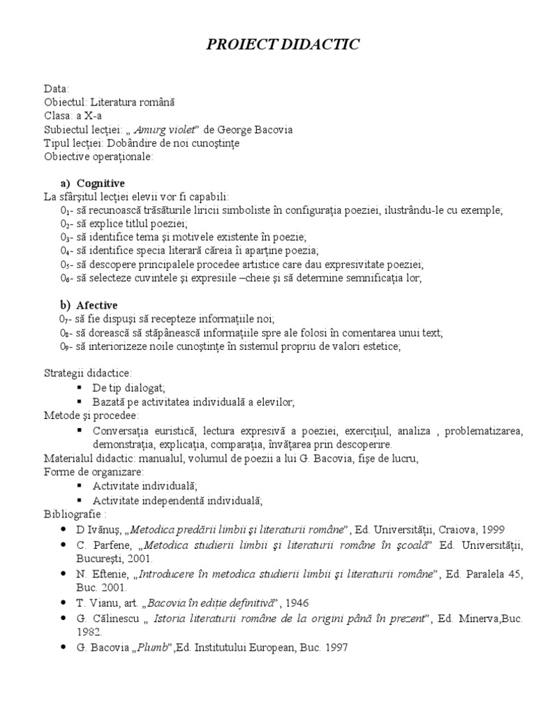 Data: Obiectul: Literatura romn Clasa: a X-a Subiectul leciei: Amurg violet de George Bacovia Tipul leciei: Dobndire de noi cunotine Obiective operaionale: a) Cognitive La sfritul leciei elevii vor fi capabili: 01- s recunoasc trsturile liricii simboliste n configuraia poeziei, ilustrndu-le cu exemple; 02- s explice titlul poeziei; 03- s identifice tema i motivele existente n poezie; 04- s identifice specia literar creia i aparine poezia; 05- s descopere principalele procedee artistice care dau expresivitate poeziei; 06- s selecteze cuvintele i expresiile cheie i s determine semnificaia lor;