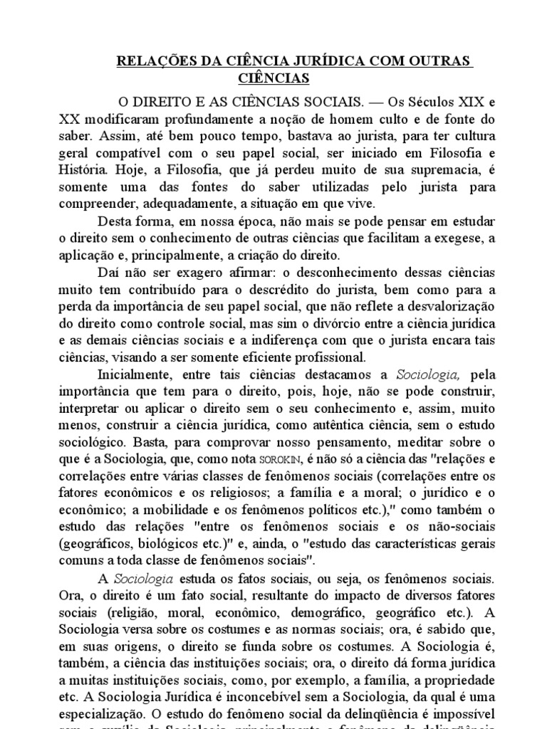 Os Sculos XIX e XX modificaram profundamente a noo de homem culto e de fonte do saber. Assim, at bem pouco tempo, bastava ao jurista, para ter cultura geral compatvel com o seu papel social, ser iniciado em Filosofia e Histria. Hoje, a Filosofia, que j perdeu muito de sua supremacia, somente uma das fontes do saber utilizadas pelo jurista para compreender, adequadamente, a situao em que vive. Desta forma, em nossa poca, no mais se pode pensar em estudar o direito sem o conhecimento de outras cincias que facilitam a exegese, a aplicao e, principalmente, a criao do direito. Da no ser exagero afirmar: o desconhecimento dessas cincias muito tem contribudo para o descrdito do jurista, bem como para a perda da importncia de seu papel social, que no reflete a desvalorizao do direito como controle social, mas sim o divrcio entre a cincia jurdica e as demais cincias sociais e a indiferena com que o jurista encara tais cincias, visando a ser somente eficiente profissional. Inicialmente, entre tais cincias destacamos a Sociologia, pela importncia que tem para o direito, pois, hoje, no se pode construir, interpretar ou aplicar o direito sem o seu conhecimento e, assim, muito menos, construir a cincia jurdica, como autntica cincia, sem o estudo sociolgico. Basta, para comprovar nosso pensamento, meditar sobre o que a Sociologia, que, como nota SOROKIN, no s a cincia das "relaes e correlaes entre vrias classes de fenmenos sociais (correlaes entre os fatores econmicos e os religiosos; a famlia e a moral; o jurdico e o econmico; a mobilidade e os fenmenos polticos etc.)," como tambm o estudo das relaes "entre os fenmenos sociais e os no-sociais (geogrficos, biolgicos etc.)" e, ainda, o "estudo das caractersticas gerais comuns a toda classe de fenmenos sociais". A Sociologia estuda os fatos sociais, ou seja, os fenmenos sociais. Ora, o direito um fato social, resultante do impacto de diversos fatores sociais (religio, moral, econmico, demogrfico, geogrfico etc.). A Sociologia versa sobre os costumes e as normas sociais; ora, sabido que, em suas origens, o direito se funda sobre os costumes. A Sociologia , tambm, a cincia das instituies sociais; ora, o direito d forma jurdica a muitas instituies sociais, como, por exemplo, a famlia, a propriedade etc. A Sociologia Jurdica inconcebvel sem a Sociologia, da qual uma especializao. O estudo do fenmeno social da delinqncia impossvel sem o auxlio da Sociologia, principalmente o fenmeno da delinqncia
