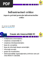 Definirea i identificarea infrastructurilor Avnd n vedere importana infrastructurilor n susinerea ansamblului mecanismelor aferente stabilitii i funcionalitii n condiii de securitate i siguran a sistemelor economice i sociale, literatura de specialitate clasific infrastructurile n trei mari categorii : Infrastructurile obinuite reprezint o structur cadru, care asigur construcia i funcionarea unui sistem; Infrastructurile speciale au un rol consistent n funcionarea sistemelor i proceselor, avnd un grad ridicat de stabilitate i securitate n ansamblul mecanismelor vieii economico-sociale de interes regional. Aceste categorii de infrastructuri, supuse unor disfuncii i vulnerabiliti, precum i ntr-un context de insecuritate, pot intra n categoria celor critice; Infrastructurile critice sunt, de regul, determinante n stabilitatea, securitatea i sigurana sistemelor i proceselor, avnd un rol important n derularea proceselor economicosociale, politice i militare. Gradul de criticitate al acestor infrastructuri este corelat efectelor semnificative induse de perturbarea ori scoaterea din funciune a acestora, inclusiv pe o perioad foarte scurt. Dei abordrile difer, avnd drept punct de plecare elementele comune privind importana funcionrii n siguran i efectele induse, conceptul de infrastructur critic poate fi asimilat cu orice entitate economic funcional, care ofer produse, bunuri i servicii de utilitate public, vitale pentru ntreaga societate i a crei distrugere, degradare ori aducere n stare de nefuncionare produce un impact major n plan economico-social, la nivel micro i macroregional. 4