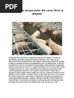 Generalitati Conservele de carne sunt produse alimentare obinute prin ambalarea crnii mpreun cu alte componente n recipiente rezistente i impermeabile, nchise ermetic i sterilizate, frecvent prin tehnica clasic de sterilizare, la temperaturi cuprinse ntre 119 121C. Produsul sterilizat trebuie s rmn stabil pentru mai muli ani, oricare ar fi temperatura de depozitare (0 - 25C). Conservele de carne asigur: rezerve de hran pentru perioade lungi de timp i pentru perioade de criz; concentrarea unei valori alimentare mari ntr-un volum redus; aprovizionarea continu i uniform a populaiei cu proteine de origine animal; un produs uor de manipulate i transportat pe distane mari; diversitate foarte mare de produse gata pregtite, avnd n vedere diversitatea tehnologiilor aplicate pentru fabricarea conservelor de carne. Clasificarea conservelor de carne Conservele de carne se clasific dup mai multe criterii: [Link] gradul de sterilizare: conserve sterile, caracterizate prin absena total a microorganismelor forme vegetative i sporulate; distrugerea toxinelor microbiene duntoare sntii omului; inactivarea enzimelor tisulare i microbiene, care pot provoca nrutirea calitii sau chiar alterarea produsului n timpul pstrrii. Conservele de carne absolut sterile pot fi obinute n cazul folosirii la sterilizare a unor temperaturi ridicate, pentru un timp [Link] acestor temperaturi provoac ns transformri profunde n produsul conservat, care conduc la scderea calitilor senzoriale i nutritive ale acestuia i conserve cu sterilitate comercial , caracterizate prin: pstrarea, n mare msur, a nsuirilor senzoriale i nutritive ale produselor; lipsa microorganismelor patogene sau a toxinelor microbiene; stabilitate ridicat (2 - 4ani) n condiiile depozitrii normale (0 - 25C). n urma procesului de sterilizare comercial nu toate recipientele de conserve devin absolut sterile, admindu-se posibilitatea c unele din acestea s mai conin spori termofili, rezisteni termic, care nu se pot dezvolta n timpul depozitrii normale a conservelor,deoarece ei germineaz i se dezvolt la temperaturi cuprinse ntre 40 70C,(temperatura lor optim de dezvoltare fiind de 55C). Pentru conservele de carne ce se depoziteaz n climat rece sau temperat sunt tolerai sporii unor bacterii termofile, care nu se pot dezvolta la temperaturi mai mici de 40C [Link] proveniena crnii : din carne de vit, de oaie, de porc, de pasre, de pete; [Link] tehnologia aplicat: conserve sub form de paste fine omogene i alifioase (pateuri, haeuri, creme de ficat); conserve de carne n suc propriu (de vit, de porc, de oaie, de pasre, de carne); conserve din carne tocat (corned beef, luncheon meat); conserve mixte (carne de porc, costi sau crnciori cu fasole boabe, carne de porc cu orez, gula cu carne de porc saude vit, Kalops, paprica cu carne de porc, ardei umplui cu carne, sarmale n foi de varz cu carne de porc, mruntaie de porc n sos de vin, limb de vit,prjoale n sos marinat, chiftelue cu ciuperci, pilaf de pasre, rulad de carne cu castravei murai, ciorb de burt, etc.); [Link] destinaie: conserve obinuite, conserve dietetice, conserve pentru copii . Examenul organoleptic al conservelor din carne Se urmrete coninutul propriuzis ct i aprecierea lichidelor de acoperire (suc, ulei, sos). Acest examen urmrete aspectul, consisten, culoarea, mirosul i gustul. Aspectul coninutului la conservele de carne este specific sortimentului. Coninutul trebuie s umple n ntregime recipientul, fr aderen (lipire) de tabl, fr spum sau goluri de aer, fr mbrumare puternic. Bucile de carne i pstreaz forma la scoaterea atent din recipiente. Aspectul lichidelor de acoperire. Acestea nu trebuie s conin sfrmituri abundente de carne,