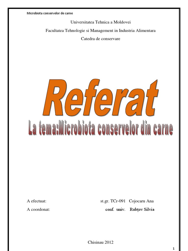 face pe sortimente si loturi de fabricatie, pentru a se usura. Livrarea trebuie facuta n ordinea vechimii loturilor. n timpul depozitarii trebuie respectati urmatorii parametrii: - temperatura cuprinsa ntre 2 si 20C; - umiditatea, maxim 75%. Peste pragul de 75%, umiditatea favorizeaza procesul de ruginire a cutiei, iar pentru a evita acest lucru se opteaza pentru depozite uscate si ventilate. Durata depozitarii variaza n functie de sortiment, dar nici ntr-un caz nu va fi mai mare de 24 de luni. Cutiile care stiu ca vor fi depozitate mai mult timp li se vor aplica un tratament special, care consta n ungerea la exterior, pentru a forma un strat protector care previne ruginirea sau printr-o cufundare n baie de ulei mineral cald. Aplicarea HACCP Principalul risc asociat conservelor de carne este prezenta lui Clostridium botulinum si a toxinei produse de aceasta, botulina, care provoaca boala numita botulism. Pentru a se evita infectarea cu aceasta toxina, sistemul HACCP, propune nasprirea controlului nchiderii cutiilor de conserve. Concluzie: Conservele de carne sunt produse folosite des de consumator, deaceea este de dorit respectarea normelor tehnologice, microbiologice si de igiena in producerea acestor alimente. Conservele de carne trebuie sa prezinte in sine produse cu un continut marit de substante nutritive, usor manipulat, ce aduce un aport benefic sanatatii consumatorului si sa nu-i puna viata in [Link] microbiotei conservelor de carne impune tehnologii la aplicarea unor regimuri de sterilizare cu micsorarea riscurilor de alterare a conservelor din carne.