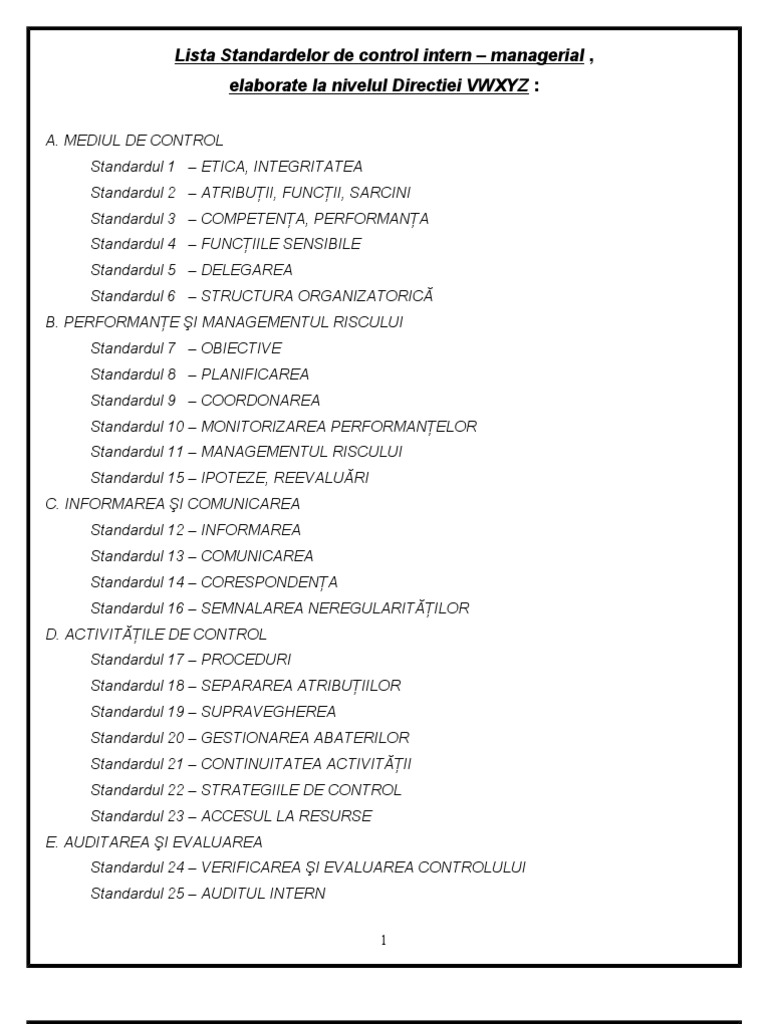 A. MEDIUL DE CONTROL Standardul 1 ETICA, INTEGRITATEA Standardul 2 ATRIBUII, FUNCII, SARCINI Standardul 3 COMPETENA, PERFORMANA Standardul 4 FUNCIILE SENSIBILE Standardul 5 DELEGAREA Standardul 6 STRUCTURA ORGANIZATORIC B. PERFORMANE I MANAGEMENTUL RISCULUI Standardul 7 OBIECTIVE Standardul 8 PLANIFICAREA Standardul 9 COORDONAREA Standardul 10 MONITORIZAREA PERFORMANELOR Standardul 11 MANAGEMENTUL RISCULUI Standardul 15 IPOTEZE, REEVALURI C. INFORMAREA I COMUNICAREA Standardul 12 INFORMAREA Standardul 13 COMUNICAREA Standardul 14 CORESPONDENA Standardul 16 SEMNALAREA NEREGULARITILOR D. ACTIVITILE DE CONTROL Standardul 17 PROCEDURI Standardul 18 SEPARAREA ATRIBUIILOR Standardul 19 SUPRAVEGHEREA Standardul 20 GESTIONAREA ABATERILOR Standardul 21 CONTINUITATEA ACTIVITII Standardul 22 STRATEGIILE DE CONTROL Standardul 23 ACCESUL LA RESURSE E. AUDITAREA I EVALUAREA Standardul 24 VERIFICAREA I EVALUAREA CONTROLULUI Standardul 25 AUDITUL INTERN 1