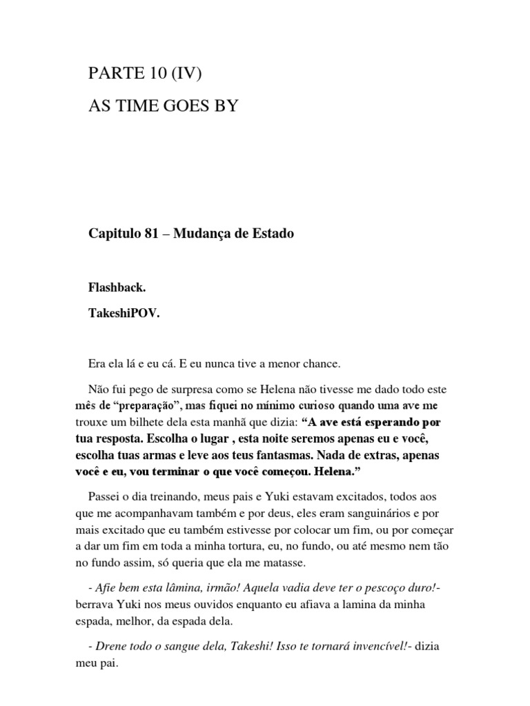 Era ela l e eu c. E eu nunca tive a menor chance. No fui pego de surpresa como se Helena no tivesse me dado todo este ms de preparao, mas fiquei no mnimo curioso quando uma ave me trouxe um bilhete dela esta manh que dizia: A ave est esperando por tua resposta. Escolha o lugar , esta noite seremos apenas eu e voc, escolha tuas armas e leve aos teus fantasmas. Nada de extras, apenas voc e eu, vou terminar o que voc comeou. Helena. Passei o dia treinando, meus pais e Yuki estavam excitados, todos aos que me acompanhavam tambm e por deus, eles eram sanguinrios e por mais excitado que eu tambm estivesse por colocar um fim, ou por comear a dar um fim em toda a minha tortura, eu, no fundo, ou at mesmo nem to no fundo assim, s queria que ela me matasse. - Afie bem esta lmina, irmo! Aquela vadia deve ter o pescoo duro!berrava Yuki nos meus ouvidos enquanto eu afiava a lamina da minha espada, melhor, da espada dela. - Drene todo o sangue dela, Takeshi! Isso te tornar invencvel!- dizia meu pai.