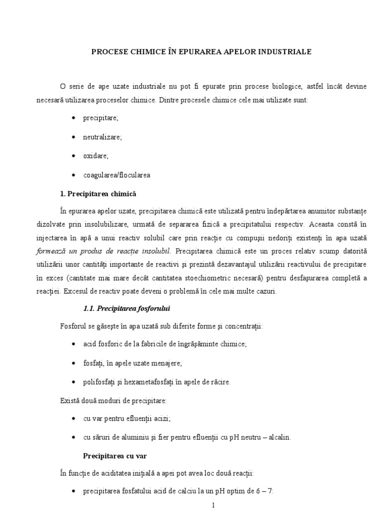 1. Precipitarea chimic n epurarea apelor uzate, precipitarea chimic este utilizat pentru ndeprtarea anumitor substane dizolvate prin insolubilizare, urmat de separarea fizic a precipitatului respectiv. Aceasta const n injectarea n ap a unui reactiv solubil care prin reacie cu compuii nedorii existeni n apa uzat formeaz un produs de reacie insolubil. Precipitarea chimic este un proces relativ scump datorit utilizrii unor cantiti importante de reactivi i prezint dezavantajul utilizrii reactivului de precipitare n exces (cantitate mai mare dect cantitatea stoechiometric necesar) pentru desfaurarea complet a reaciei. Excesul de reactiv poate deveni o problem n cele mai multe cazuri. 1.1. Precipitarea fosforului Fosforul se gsete n apa uzat sub diferite forme i concentraii: acid fosforic de la fabricile de ngrminte chimice; fosfai, n apele uzate menajere; polifosfai i hexametafosfai n apele de rcire.