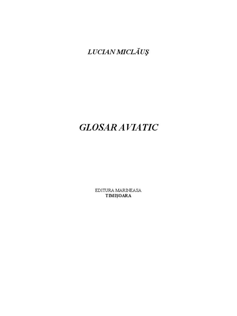 CUVNT NAINTE Lucrarea de fa se adreseaz tuturor celor care au nevoie de informaii sau lmuriri n legtur cu lexicul aviatic (civil, militar i sportiv), care i face simit prezena tot mai frecvent la sfritul acestui deceniu, cnd asistm lao adevrat explozie aviatic. Glosarul nregistreaz i explic termenii tehnici cu o frecven ridicat n limbajul de specialitate, coninnd ns unele date legate despre zburtori, care au adus o contribuie valoroas n promovarea activitii aviatice timiorene de dup 1980, cu toate obstacolele ivite n calea pasiunii lor. Autorul