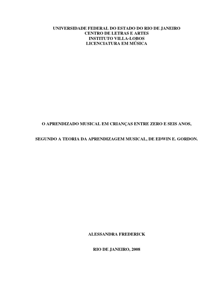 3 FREDERICK, Alessandra. O aprendizado musical em crianas entre zero e seis anos, segundo a Teoria da Aprendizagem Musical, de Edwin Gordon. 2008. Monografia de fim de curso de Licenciatura em Msica Instituto Villa-Lobos, Centro de Letras e Artes, Universidade Federal do Estado do Rio de Janeiro.