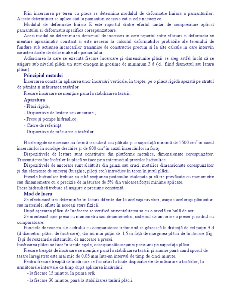 Aceste determinari se aplica atat la pamanturi coezive cat si cele necoezive. Modulul de deformatie liniara E este raportul dintre efortul unitar de compresiune aplicat pamantului si deformatia specifica corespunzatoare. Acest modul se determina in domeniul de incarcari in care raportul intre eforturi si deformatii se mentine aproximativ constant si este necesar la calculul deformatiilor probabile ale terenului de fundare sub actiunea incarcarilor transmise de constructie precum si la alte calcule in care intervin caracteristicile de deformatie ale pamantului. Adncimea la care se execut fiecare ncercare i dimensiunile plcii se aleg astfel nct s se asigure sub nivelul plcii un strat omogen in grosime de minimum 3 d ( d , fiind diametrul sau latura plcii).