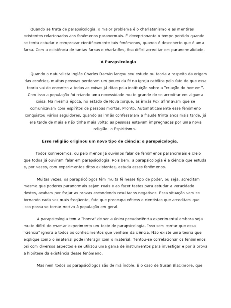 . decepcionante o tempo perdido quando se tenta estudar e comprovar cientificamente tais fenmenos, quando descoberto que uma farsa. Com a existncia de tantas farsas e charlates, fica difcil acreditar em paranormalidade. A Parapsicologia Quando o naturalista ingls Charles Darwin lanou seu estudo ou teoria a respeito da origem das espcies, muitas pessoas perderam um pouco da f na igreja catlica pelo fato de que essa teoria vai de encontro a todas as coisas j ditas pela instituio sobre a criao do homem. Com isso a populao foi criando uma necessidade muito grande de se acreditar em alguma coisa. Na mesma poca, no estado de Nova Iorque, as irms Fox afirmavam que se comunicavam com espritos de pessoas mortas. Pronto. Automaticamente esse fenmeno conquistou vrios seguidores, quando as irms confessaram a fraude trinta anos mais tarde, j era tarde de mais e no tinha mais volta: as pessoas estavam impregnadas por uma nova religio: o Espiritismo. Essa religio originou um novo tipo de cincia: a parapsicologia. Todos conhecemos, ou pelo menos j ouvimos falar de fenmenos paranormais e creio que todos j ouviram falar em parapsicologia. Pois bem, a parapsicologia a cincia que estuda e, por vezes, com experimentos ditos existentes, estuda esses fenmenos. Muitas vezes, os parapsiclogos tm muita f nesse tipo de poder, ou seja, acreditam mesmo que poderes paranormais sejam reais e ao fazer testes para estudar a veracidade destes, acabam por forjar as provas escondendo resultados negativos. Essa situao vem se tornando cada vez mais freqente, fato que preocupa cticos e cientistas que acreditam que isso possa se tornar nocivo populao em geral. A parapsicologia tem a honra de ser a nica pseudocincia experimental embora seja muito difcil de chamar experimento um teste de parapsicologia. Isso sem contar que essa cincia ignora a todos os conhecimentos que venham da cincia. No existe uma teoria que explique como o imaterial pode interagir com o material. Tentou-se correlacionar os fenmenos psi com diversos aspectos e se utilizou uma gama de instrumentos para investigar e por prova a hiptese da existncia desse fenmeno. Mas nem todos os parapsiclogos so de m ndole. o caso de Susan Blackmore, que