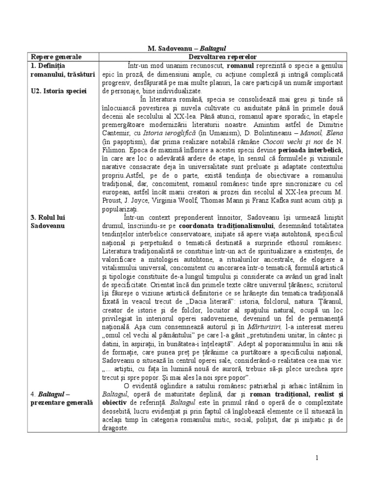 . Definiia ntr-un mod unanim recunoscut, romanul reprezint o specie a genului romanului, trsturi epic n proz, de dimensiuni ample, cu aciune complex i intrig complicat progresiv, desfurat pe mai multe planuri, la care particip un numr important U2. Istoria speciei de personaje, bine individualizate. n literatura romn, specia se consolideaz mai greu i tinde s nlocuiasc povestirea i nuvela cultivate cu asiduitate pn n primele dou decenii ale secolului al XX-lea. Pn atunci, romanul apare sporadic, n etapele premergtoare modernizrii literaturii noastre. Amintim astfel de Dimitrie Cantemir, cu Istoria ieroglific (n Umanism), D. Bolintineanu Manoil, Elena (n paoptism), dar prima realizare notabil rmne Ciocoii vechi i noi de N. Filimon. Epoca de maxim nflorire a acestei specii devine perioada interbelic, n care are loc o adevrat ardere de etape, n sensul c formulele i viziunile narative consacrate deja n universalitate sunt preluate i adaptate contextului [Link], pe de o parte, exist tendina de obiectivare a romanului tradiional, dar, concomitent, romanul romnesc tinde spre sincronizare cu cel european, astfel nct marii creatori ai prozei din secolul al XX-lea precum M. Proust, J. Joyce, Virginia Woolf, Thomas Mann i Franz Kafka sunt acum citii i popularizai. 3. Rolul lui ntr-un context preponderent nnoitor, Sadoveanu i urmeaz linitit Sadoveanu drumul, nscriindu-se pe coordonata tradiionalismului, desemnnd totalitatea tendinelor interbelice conservatoare, iniiate s apere viaa autohton, specificul naional i perpetund o tematic destinat a surprinde ethosul romnesc. Literatura tradiionalist se constituie ntr-un act de spiritualizare a existenei, de valorificare a mitologiei autohtone, a ritualurilor ancestrale, de elogiere a vitalismului universal, concomitent cu ancorarea ntr-o tematic, formul artistic i tipologie constituite de-a lungul timpului i considerate ca avnd un grad nalt de specificitate. Orientat nc din primele texte ctre universul rnesc, scriitorul i furee o viziune artistic definitorie ce se hrnete din tematica tradiional fixat n veacul trecut de Dacia literar: istoria, folclorul, natura. ranul, creator de istorie i de folclor, locuitor al spaiului natural, ocup un loc privilegiat n interiorul operei sadoveniene, devenind un fel de permanen naional. Aa cum consemneaz autorul i n Mrturisiri, l-a interesat mereu omul cel vechi al pmntului pe care l-a gsit pretutindeni unitar, n cntec i datini, n aspiraii, n buntatea-i neleapt. Adept al poporanismului n anii si de formaie, care punea pre pe rnime ca purttoare a specificului naional, Sadoveanu o situeaz n centrul operei sale, considernd-o realitatea cea mai vie: ... artitii, cu faa n lumin nou de auror, trebuie s-i plece urechea spre trecut i spre popor. i mai ales la noi spre popor. O evident oglindire a satului romnesc patriarhal i arhaic ntlnim n 4. Baltagul Baltagul, oper de maturitate deplin, dar i roman tradiional, realist i prezentare general obiectiv de referin. Baltagul este n primul rnd o oper de o complexitate deosebit, lucru evideniat i prin faptul c nglobeaz elemente ce l situeaz n acelai timp n categoria romanului mitic, social, poliist, dar i iniiatic i de dragoste.