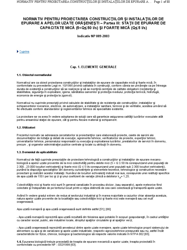 1.10. Pentru substanele reinute, inclusiv nmolurile primare i: biologice, instalaiile de epurare mecano-biologic trebuie s asigure obinerea de produse finite, igienice, valorificabile i uor de integrat n mediul natural. 1.11. La proiectarea staiilor de epurare a apelor uzate provenite de la colectivitile mici, se vor avea n vedere prevederile standardelor i reglementrilor indicate n tabelul din Anexa 1, precum i recomandrile literaturii de specialitate (cuprinse n bibliografia anexat - Anexa 4). 1.12. Categoria i clasa de importan a construciilor i; instalaiilor de epurare se va determina conform prevederilor HGR nr. 766/21.11.1997, respectiv STAS 4273, precum i a recomandrilor cuprinse n legea 10/1995. [top]