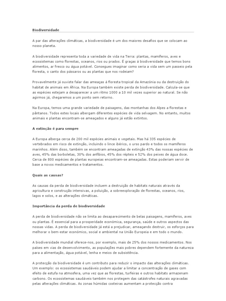 . A biodiversidade representa toda a variedade de vida na Terra: plantas, mamferos, aves e ecossistemas como florestas, oceanos, rios ou prados. graas biodiversidade que temos bons alimentos, ar fresco ou gua potvel. Consegues imaginar como seria a vida sem um passeio pela floresta, o canto dos pssaros ou as plantas que nos rodeiam? Provavelmente j ouviste falar das ameaas floresta tropical da Amaznia ou da destruio do habitat de animais em frica. Na Europa tambm existe perda de biodiversidade. Calcula-se que as espcies estejam a desaparecer a um ritmo 1000 a 10 mil vezes superior ao natural. Se no agirmos j, chegaremos a um ponto sem retorno. Na Europa, temos uma grande variedade de paisagens, das montanhas dos Alpes a florestas e pntanos. Todos estes locais albergam diferentes espcies de vida selvagem. No entanto, muitos animais e plantas encontram-se ameaados e alguns j esto extintos. A extino para sempre A Europa alberga cerca de 200 mil espcies animais e vegetais. Mas h 335 espcies de vertebrados em risco de extino, incluindo o lince ibrico, o urso pardo e todos os mamferos marinhos. Alm disso, tambm se encontram ameaadas de extino 43% das nossas espcies de aves, 45% das borboletas, 30% dos anfbios, 45% dos rpteis e 52% dos peixes de gua doce. Cerca de 800 espcies de plantas europeias encontram-se ameaadas. Estas poderiam servir de base a novos medicamentos e tratamentos. Quais as causas? As causas da perda de biodiversidade incluem a destruio de habitats naturais atravs da agricultura e construo intensivas, a poluio, a sobreexplorao de florestas, oceanos, rios, lagos e solos, e as alteraes climticas. Importncia da perda de biodiversidade A perda de biodiversidade no se limita ao desaparecimento de belas paisagens, mamferos, aves ou plantas. essencial para a prosperidade econmica, segurana, sade e outros aspectos das nossas vidas. A perda de biodiversidade j est a prejudicar, ameaando destruir, os esforos para melhorar o bem-estar econmico, social e ambiental na Unio Europeia e em todo o mundo. A biodiversidade mundial oferece-nos, por exemplo, mais de 25% dos nossos medicamentos. Nos pases em vias de desenvolvimento, as populaes mais pobres dependem fortemente da natureza para a alimentao, gua potvel, lenha e meios de subsistncia. A proteco da biodiversidade um contributo para reduzir o impacto das alteraes climticas. Um exemplo: os ecossistemas saudveis podem ajudar a limitar a concentrao de gases com efeito de estufa na atmosfera, uma vez que as florestas, turfeiras e outros habitats armazenam carbono. Os ecossistemas saudveis tambm nos protegem das catstrofes naturais agravadas pelas alteraes climticas. As zonas hmidas costeiras aumentam a proteco contra