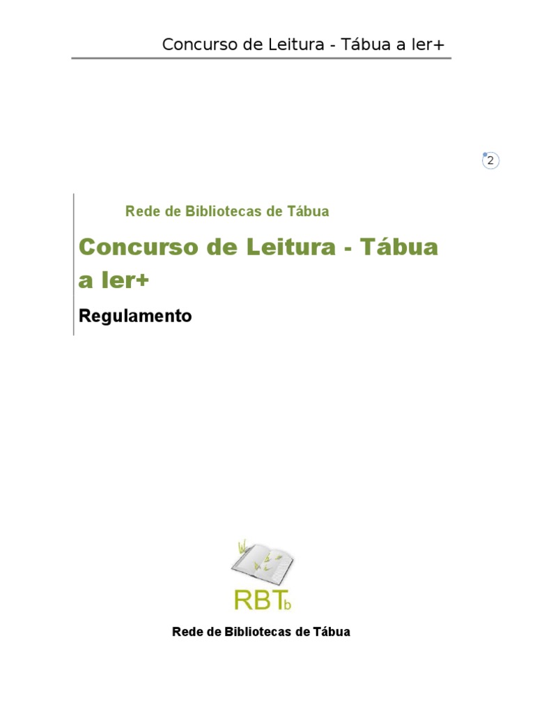 Art 1 mbito e Objectivos 1. Inspirado no Concurso Nacional de Leitura e levando em conta a necessidade de promover no concelho o gosto pela leitura e o contacto com os livros, a Rede de Bibliotecas de Tbua (RBTb) promove, anualmente, o Concurso de Leitura Tbua a ler + (CL). 2. Tendo como objectivo estimular a prtica da leitura entre os alunos do 1 e 2 Ciclos do Ensino Bsico, o concurso pretende avaliar a leitura de obras literrias pelos estudantes desses graus de ensino do concelho de Tbua. 3. O Concurso decorrer em trs fases diferentes: a. 1. Fase, a realizar nas escolas/Turmas; b. 2. Fase a realizar numa das escolas do agrupamento; c. 3. Fase, correspondente Final Concelhia a realizar na Biblioteca Municipal Joo Brando. Art 2 Condies gerais de participao 1. A participao no concurso est aberta aos alunos do 1 e 2 ciclos do Ensino Bsico que a ele aderirem, por manifesto interesse junto do professor / dinamizador da 1. fase. 2. Para efeito da participao no Concurso, os concorrentes comprometem-se a submeter-se ao presente Regulamento e s decises dos diversos Jris. 3. Os candidatos no podero participar sem a autorizao expressa dos encarregados de educao. Art 3 Categorizao dos concorrentes Os concorrentes sero repartidos em duas categorias: