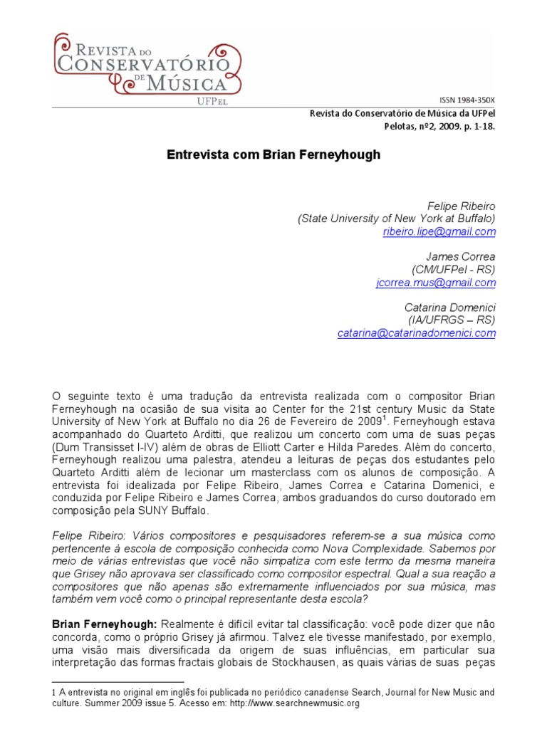 O seguinte texto uma traduo da entrevista realizada com o compositor Brian Ferneyhough na ocasio de sua visita ao Center for the 21st century Music da State University of New York at Buffalo no dia 26 de Fevereiro de 20091. Ferneyhough estava acompanhado do Quarteto Arditti, que realizou um concerto com uma de suas peas (Dum Transisset I-IV) alm de obras de Elliott Carter e Hilda Paredes. Alm do concerto, Ferneyhough realizou uma palestra, atendeu a leituras de peas dos estudantes pelo Quarteto Arditti alm de lecionar um masterclass com os alunos de composio. A entrevista foi idealizada por Felipe Ribeiro, James Correa e Catarina Domenici, e conduzida por Felipe Ribeiro e James Correa, ambos graduandos do curso doutorado em composio pela SUNY Buffalo. Felipe Ribeiro: Vrios compositores e pesquisadores referem-se a sua msica como pertencente escola de composio conhecida como Nova Complexidade. Sabemos por meio de vrias entrevistas que voc no simpatiza com este termo da mesma maneira que Grisey no aprovava ser classificado como compositor espectral. Qual a sua reao a compositores que no apenas so extremamente influenciados por sua msica, mas tambm vem voc como o principal representante desta escola? Brian Ferneyhough: Realmente difcil evitar tal classificao: voc pode dizer que no concorda, como o prprio Grisey j afirmou. Talvez ele tivesse manifestado, por exemplo, uma viso mais diversificada da origem de suas influncias, em particular sua interpretao das formas fractais globais de Stockhausen, as quais vrias de suas peas