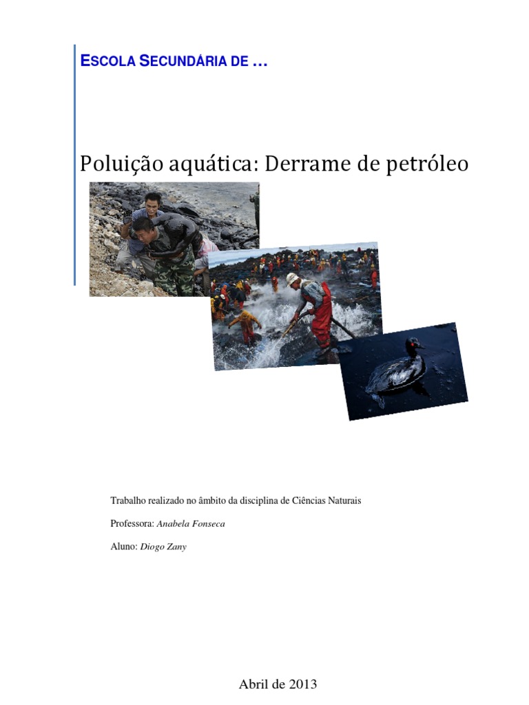 Aps a aula de dia 03-04-2013, fiquei curioso sobre o que sucede aps uma catstrofe de derrame de petrleo no mar, quis saber um pouco mais sobre os mtodos e tcnicas utilizados no combate da poluio e qual o impacto ambiental deste tipo de catstrofes. Tentei dar resposta a uma questo que me veio ao pensamento: O que fazer aps um derramamento de petrleo? Descobri que existem diversos mtodos, mas que os especialistas ainda no so consensuais quanto ao melhor mtodo e que o impacto ambiental da explorao do petrleo ou gs no se resume aos momentos de catstrofe, de derrame de petrleo no mar. Existem sempre riscos para o ambiente desde a fase inicial de mapeamento at fase final de transporte do produto.