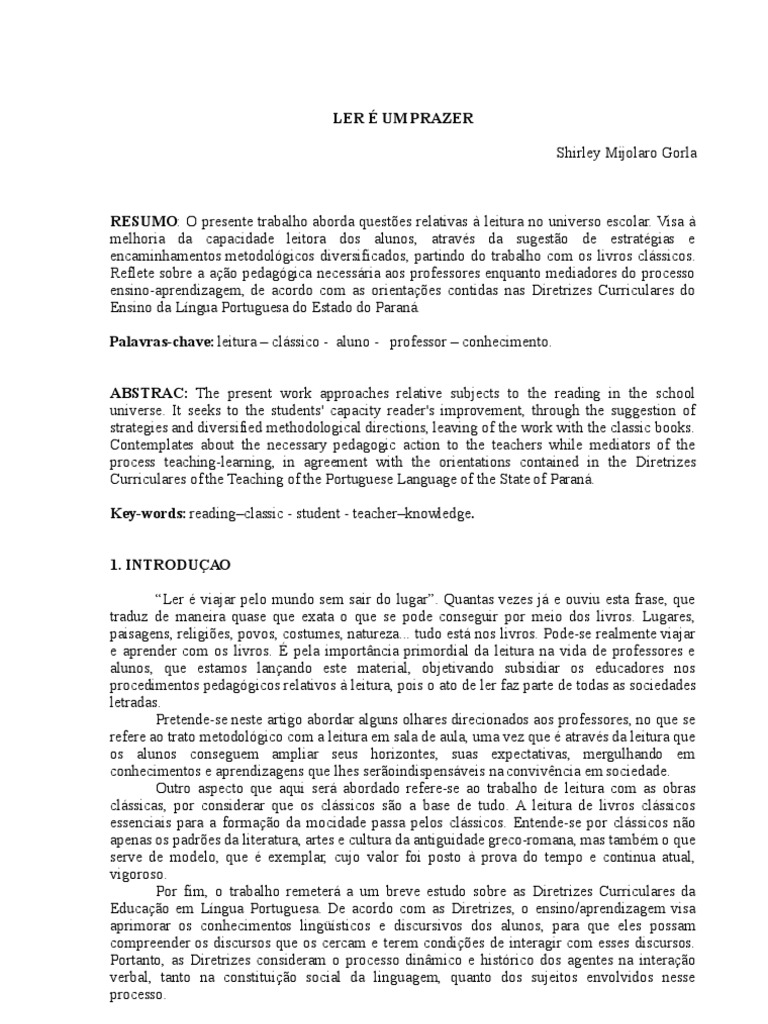 RESUMO: O presente trabalho aborda questes relativas leitura no universo escolar. Visa melhoria da capacidade leitora dos alunos, atravs da sugesto de estratgias e encaminhamentos metodolgicos diversificados, partindo do trabalho com os livros clssicos. Reflete sobre a ao pedaggica necessria aos professores enquanto mediadores do processo ensino-aprendizagem, de acordo com as orientaes contidas nas Diretrizes Curriculares do Ensino da Lngua Portuguesa do Estado do Paran. Palavras-chave: leitura clssico - aluno - professor conhecimento. ABSTRAC: The present work approaches relative subjects to the reading in the school universe. It seeks to the students' capacity reader's improvement, through the suggestion of strategies and diversified methodological directions, leaving of the work with the classic books. Contemplates about the necessary pedagogic action to the teachers while mediators of the process teaching-learning, in agreement with the orientations contained in the Diretrizes Curriculares of the Teaching of the Portuguese Language of the State of Paran. Key-words: readingclassic - student - teacherknowledge. 1. INTRODUAO Ler viajar pelo mundo sem sair do lugar. Quantas vezes j e ouviu esta frase, que traduz de maneira quase que exata o que se pode conseguir por meio dos livros. Lugares, paisagens, religies, povos, costumes, natureza... tudo est nos livros. Pode-se realmente viajar e aprender com os livros. pela importncia primordial da leitura na vida de professores e alunos, que estamos lanando este material, objetivando subsidiar os educadores nos procedimentos pedaggicos relativos leitura, pois o ato de ler faz parte de todas as sociedades letradas. Pretende-se neste artigo abordar alguns olhares direcionados aos professores, no que se refere ao trato metodolgico com a leitura em sala de aula, uma vez que atravs da leitura que os alunos conseguem ampliar seus horizontes, suas expectativas, mergulhando em conhecimentos e aprendizagens que lhes seroindispensveis na convivncia em sociedade. Outro aspecto que aqui ser abordado refere-se ao trabalho de leitura com as obras clssicas, por considerar que os clssicos so a base de tudo. A leitura de livros clssicos essenciais para a formao da mocidade passa pelos clssicos. Entende-se por clssicos no apenas os padres da literatura, artes e cultura da antiguidade greco-romana, mas tambm o que serve de modelo, que exemplar, cujo valor foi posto prova do tempo e continua atual, vigoroso. Por fim, o trabalho remeter a um breve estudo sobre as Diretrizes Curriculares da Educao em Lngua Portuguesa. De acordo com as Diretrizes, o ensino/aprendizagem visa aprimorar os conhecimentos lingsticos e discursivos dos alunos, para que eles possam compreender os discursos que os cercam e terem condies de interagir com esses discursos. Portanto, as Diretrizes consideram o processo dinmico e histrico dos agentes na interao verbal, tanto na constituio social da linguagem, quanto dos sujeitos envolvidos nesse processo.
