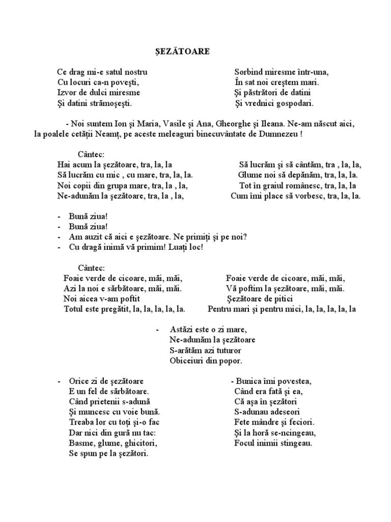 Bun ziua! Bun ziua! Am auzit c aici e eztoare. Ne primii i pe noi? Cu drag inim v primim! Luai loc! Cntec: Foaie verde de cicoare, mi, mi, Azi la noi e srbtoare, mi, mi. Noi aicea v-am poftit Totul este pregtit, la, la, la, la, la. Foaie verde de cicoare, mi, mi, V poftim la eztoare, mi, mi. eztoare de pitici Pentru mari i pentru mici, la, la, la, la, la