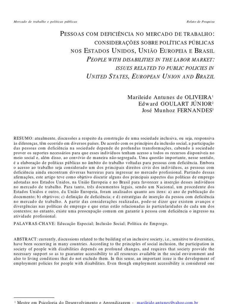 constituintes importantes na elaborao de documentos oficiais na rea. Por se tratar de um processo recente, algumas lacunas e controvrsias ainda permanecem, sobretudo no que se refere ao impacto dos documentos legais sobre a implementao de aes no mbito do trabalho. Quanto legislao existente nos Estados Unidos, o proposto no The American With Disabilities Act (ADA) parece estar conceitualmente em consonncia com os princpios de uma sociedade para todos. No entanto, a sua real efetividade pode ser questionada, uma vez que grande parte das responsabilidades tem sido atribuda s organizaes, sem a necessria anlise de quais outras instncias devem interagir de modo que os recursos disponveis na sociedade como um todo atendam demanda de maneira efetiva. J no caso da Unio Europeia, as aes previstas no European Action Plan tm alcance considervel sobre a elaborao de polticas pblicas nos Estados-Membros atualmente, permitindo a proviso de suportes de maneira orientada. Por outro lado, Mabbett (2005) ressalta que os Estados-Membros prezam pela considervel autonomia que os mesmos tm no desenvolvimento de algumas estratgias na rea e, nesse sentido, torna-se fundamental a avaliao da interligao dessas diferentes polticas na promoo das mudanas para garantir o acesso das pessoas com deficincia ao mercado profissional. Por ltimo, uma das questes mais incisivas em relao proposta do Decreto 3.298/99 repousa sobre o estabelecimento de cotas como poltica de emprego no Brasil. As anlises realizadas por Neri (2002) evidenciam que, embora seja considerado como um avano em relao legislao nacional na rea, esse sistema tem atendido timidamente seus propsitos. Destarte, cabe pensar nas possveis vantagens de se reiterar a adoo desse sistema no contexto nacional e, nesse caso, refletir sobre quais as aes a serem implementadas para que a poltica de cotas resulte na efetiva participao das pessoas com deficincia no mercado de trabalho. Adicionalmente, parece que ainda existem dificuldades em adotar uma nova concepo de deficincia, bem como de se elaborar objetivos claramente contextualizados com a proposta de uma sociedade aberta a todos. CONCLUSO O presente trabalho pretendeu traar um panorama das polticas pblicas voltadas para a insero da pessoa com deficincia em trs contextos Estados Unidos, Unio Europeia e Brasil e, para tanto, recorreu anlise de seus principais referentes legais The with Disabilities Act, European Action Plan e Decreto 3.298/99 em relao aos seguintes aspectos: a) ano de publicao do documento, b) objetivos, c) definio de deficincia e d) estratgias de insero da pessoa com deficincia no mercado de trabalho. Pode-se dizer que esse estudo contribuiu com a discusso a respeito de quais os avanos e controvrsias ainda existentes na legislao dos contextos