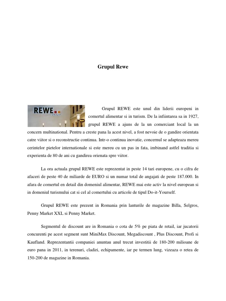 Grupul REWE este unul din liderii europeni in comertul alimentar si in turism. De la infiintarea sa in 1927, grupul REWE a ajuns de la un comerciant local la un concern multinational. Pentru a creste pana la acest nivel, a fost nevoie de o gandire orientata catre viitor si o reconstructie continua. Intr-o continua inovatie, concernul se adapteaza mereu cerintelor pietelor internationale si este mereu cu un pas in fata, imbinand astfel traditia si experienta de 80 de ani cu gandirea orienata spre viitor. La ora actuala grupul REWE este reprezentat in peste 14 tari europene, cu o cifra de afaceri de peste 40 de miliarde de EURO si un numar total de angajati de peste 187.000. In afara de comertul en detail din domeniul alimentar, REWE mai este activ la nivel european si in domeniul turismului cat si cel al comertului cu articole de tipul Do-it-Yourself. Grupul REWE este prezent in Romania prin lanturile de magazine Billa, Selgros, Penny Market XXL si Penny Market. Segmentul de discount are in Romania o cota de 5% pe piata de retail, iar jucatorii concurenti pe acest segment sunt MiniMax Discount, Megadiscount , Plus Discount, Profi si Kaufland. Reprezentantii companiei anuntau anul trecut investitii de 180-200 milioane de euro pana in 2011, in terenuri, cladiri, echipamente, iar pe termen lung, vizeaza o retea de 150-200 de magazine in Romania.