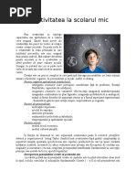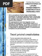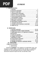 Creativitatea constituie una din problemele majore ale contemporaneitii. Marile probleme sociale, economice ,culturale, educaionale au generat o adevrat foamede creativitate menita s soluioneze aceste [Link] aceea creativitatea a devenit un concept central al psihologiei. Conceptul de creativitate i are originea n cuvntul latin creare care nseamn zmislire, furire, [Link]-o accepiune larg, creativitatea constituie un fenomen general uman,forma cea mai nalt a activitii [Link] perspectiv psihologic, creativitatea apare n cteva accepiuni importante: ca produs; ca proces; ca disponibilitate, potenialitate general uman; ca o capacitate i abilitate creativ; ca dimensiune complex de personalitate. Creativitatea este o capacitate complex care face posibil crearea de produse reale sau pur mintale, constituind un progres n planul [Link] principal a creativitii o constituie imaginaia,dar creaia de valoare real mai presupune i o motivaie, dorina de a realiza ceva nou, ceva deosebit. i cum noutatea , azi, nu se obine cu uurin o alt component implicat este voina, perseverena n a face numeroase ncercri i verificri. Imaginaia, deci creativitatea ,presupun trei nsuiri: a) fluiditatea posibilitatea de a ne imagina in scurt timp un mare numr de imagini, idei, situaii; sunt oameni care ne suprind prin ceea ce numim in mod obinuit ca fiind ,,bogia de idei, viziuni, unele complet nstrunice,dar care nou nu ne-ar putea trece prin minte; b) plasticitatea- const in uurina de a schimba punctul de vedere, modul de abordare a unei probleme, cnd un procedeu se dovedete inoperant; sunt persoane ,,rigide care greu renun la o metod, dei se vdete ineficient; c) originalitatea- este expresia noutii,a inovaiei, ea se poate constata, cnd vrem s testm posibilitile cuiva, prin raritatea statistic a unui rspuns, a unei [Link] originalitate se manifesta n diferite grade de noutate. Un colar care izbutete s soluioneze, prin propriul efort, o problema grea de matematica, dovedete oarecare 2