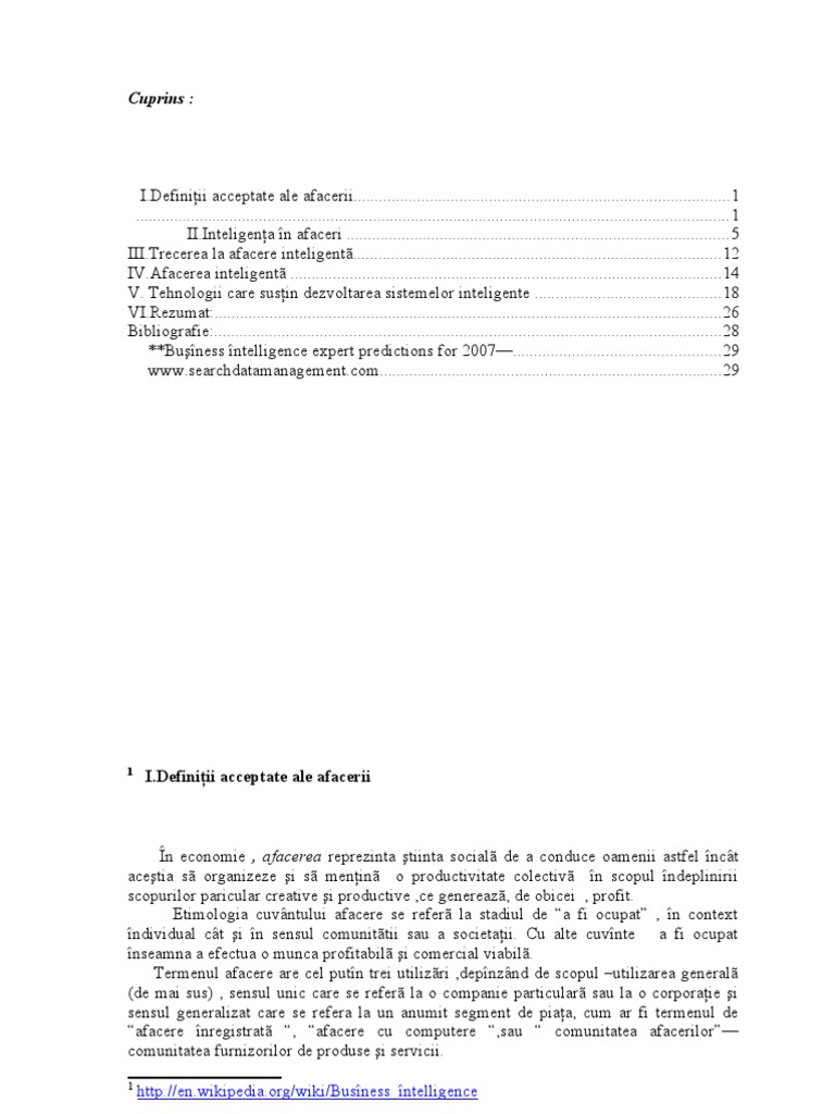 n sens restrns afacerea poate fi o entitate recunoscut legal ntr.-o societate economic unde ndivizii se organizeaz pe baza unei expertize i abilitilor de a aduce novare social i tehnologica. n economiile predomnant capitaliste , afacerile sunt formate numai cu scopul de a obine profit i sa augmenteze bogtia personal a proprietarilor lor. Proprietarii i operatorii unei afaceri au ca obiectiv prncipal chitana sau obinerea unui rezultat fnanciar n schimbul muncii lor care este concretizat n consumul de timp i energie i pentru abilitatea lor de a accepta riscul investind efort i bani far a se atepta la un succes sigur. Excepie de la aceast regul fac acele afaceri care sunt cooperative sau institutii guvernamentale. Totui definiia exact a afacerii este discutabil ca i filozofa acesteia, de exemplu unii marxisti utilizeaz mijloace de producie ca un sinonim pentru afacere ; Totui o definiie mai exact a mijloacelor de producie ar fi c acestea reprezinta resurse i echipamente cu ajutorul crora se obin produse i servicii. Afacerea este efortul organizat al unor indivizi de a produce i vinde pentru profit bunurile i serviciile care satisfac cereri ale societii. n tradiia liberei ntreprinderi indivizii sunt liberi s decid ce s produc, cum s produc i la ce pre s vand. Afacerile sunt de dou feluri: B2C(business to consumer), dac produsele i serviciile oferite se adreseaz consumatorilor i B2B(business to business), dac produsele i serviciile oferite se adreseaz altor afaceri, acestea ncorporndu-le n propriile produse i servicii. O afacere are dou scopuri sau obiective fundamentale: Supravieuirea- s reziste pe pia un timp indefinit, nfruntnd concurena, sindicatele, autorittile, luptnd cu propriile ineficiene, evalund riscurile i asigurndu-se mpotriva lor. Ctigul sau profitul s maximizeze avantajele proprietarilor afaceriintreprinztorilor acionarilor sau patronilor. O afacere adevarat reprezinta transformarea muncii, imaginaiei, riscului i capitalului ntreprinztorului n profit durabil, cu care societatea sau clientela va rsplati satisfacerea nevoilor sau plcerilor ei. Afacerea inteligenta cuprinde o larg categorie de aplicaii i tehnologii folosite pentru strngerea,stocarea,analizarea i asigurarea accesului la date cu scopul de a ajuta utilizatorii din ntreprinderi s ia decizii legate de afacere mai [Link] afacerii inteligente includ i activitile de decizie privind suportul de sistem,interogrile i rapoartele,procesele de analiz online(OLAP),analizele statistice,previziunile efectuate i adncimea datelor. Dr. Vaile Pun - Activitatea de inteligenta nu mai este un atribut exclusiv al mediului guvernamental, ci o funcie a societii cu implicatii n toate domeniile, n special cel economic. (statul nu mai este singurul promotor i aprtor al ntereselor naionale) - Obnerea ntelligence-ului pentru afaceri a devenit o component inseparabil a unui management de succes, iar pentru pieele extrem de dinamice este o capabilitate pe care companiile o dezvolt pentru obinerea i mennerea avantajului competitiv durabil. - n Statele Unite i Uniunea European exist, pe lng structuri mature de intelligence competitiv ale companiilor i o notabil component academic pentru dezvoltarea conceptual a domeniului i pregtirea profeionitilor necesari. n Uniunea European, companiile romneti trebuie s fie pregtite pentru a face fa unui mediu de afaceri nalt competitiv, n care informaia deine primatul. Mediul de 2