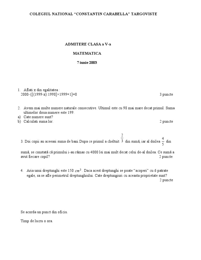 ADMITERE CLASA a V-a MATEMATICA 7 iunie 2003