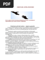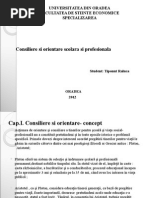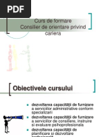 [Link] generale privind consilierea pentru carier Cariera este influenat de o multitudine de factori, cum ar fi ,,nevoi personale, context social i economic, interese, alte preocupri alte vieii adulte care reflect specificul preocuprilor fiecruia dintre noi ca actori pe scena vieii. Dei n limbajul curent noiunea de carier este frecvent utilizat, ntlnim diferite definiii. Pentru oamenii obinuii noiunea de carier este considerat sinonim celei de profesie sau ocupaie. n realitate, aceasta are alte nelesuri cum ar fi: timpul ct o anumit persoan i desfoar activitatea ntr-un anumit domeniu; poziia pe care o persoan o deine n plan social; treapt n ierarhia social sau profesional. Cariera este cadrul dinamic n care o persoan i triete viaa profesional, o succesiune evolutiv de activiti profesionale i poziii ocupate de un individ ntr-o organizaie/domeniu ocupaional, datorit aptitudinilor, cunotinelor, abilitilor i competenelor dezvoltate de-a lungul timpului. Practicienii n dezvoltarea resurselor umane consider activitatea de consiliere a carierei ca o form de asisten continu, acordat unei persoane n orice moment al vieii cu scopul de a facilita procesul de adaptare la mediul sociodinamic al pieei muncii. Persoana care solicit serviciile de consiliere este ajutat s i descopere interesele sau preferinele pentru o anumit profesie sau pentru o familie de profesii, s identifice dac are aptitudinile necesare pentru practicarea cu succes a acesteia i s i evalueze ntr-un mod realist ansele de reuit n plan profesional. Realitatea economic din prezent influeneaz preocuparea tinerilor fa de modul cum i pot alege un loc de munc potrivit i fa de valoarea tuturor aciunilor pe care ei le realizeaz n direcia construirii propriei carierei. Din aceast perspectiv s-au dezvoltat servicii de consiliere cunoscute sub diferite denumiri: consiliere privind orientarea colar i profesional, consiliere educaional, consiliere vocaional, consiliere n carier, consiliere profesional,career coaching etc. Dei n mare parte aceti termeni se suprapun din punctul de vedere al finalitii obinute de beneficiar, serviciile se difereniaz din punct de vedere al modalitii de intervenie i al