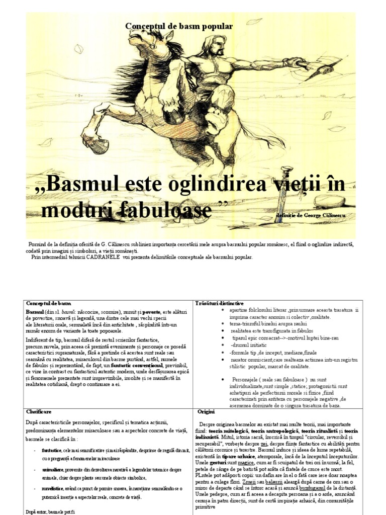 definiie de George Clinescu Pornind de la definiia oferit de G. Clinescu subliniez importana cercetrii mele asupra basmului popular romnesc, el fiind o oglindire indirect, codat prin imagini i simboluri, a vieii romneti. Prin intermediul tehnicii CADRANELE voi prezenta delimitrile conceptuale ale basmului popular.