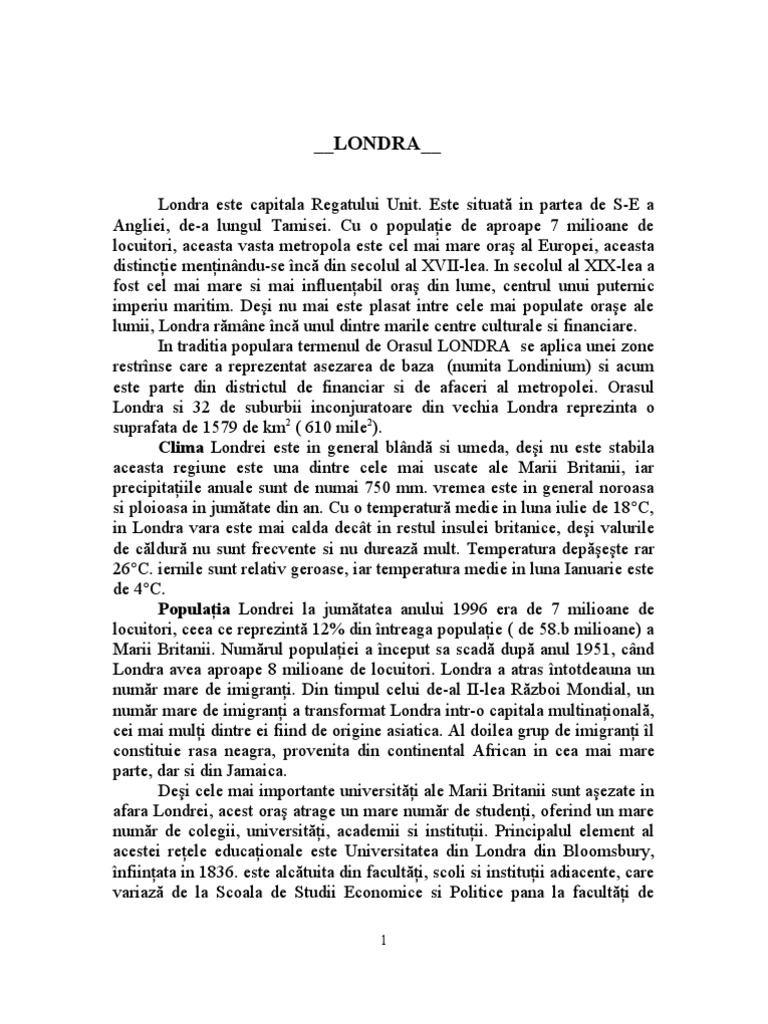 Londra este capitala Regatului Unit. Este situat in partea de S-E a Angliei, de-a lungul Tamisei. Cu o populaie de aproape 7 milioane de locuitori, aceasta vasta metropola este cel mai mare ora al Europei, aceasta distincie meninndu-se nc din secolul al XVII-lea. In secolul al XIX-lea a fost cel mai mare si mai influenabil ora din lume, centrul unui puternic imperiu maritim. Dei nu mai este plasat intre cele mai populate orae ale lumii, Londra rmne nc unul dintre marile centre culturale si financiare. In traditia populara termenul de Orasul LONDRA se aplica unei zone restrnse care a reprezentat asezarea de baza (numita Londinium) si acum este parte din districtul de financiar si de afaceri al metropolei. Orasul Londra si 32 de suburbii inconjuratoare din vechia Londra reprezinta o suprafata de 1579 de km2 ( 610 mile2). Clima Londrei este in general blnd si umeda, dei nu este stabila aceasta regiune este una dintre cele mai uscate ale Marii Britanii, iar precipitaiile anuale sunt de numai 750 mm. vremea este in general noroasa si ploioasa in jumtate din an. Cu o temperatur medie in luna iulie de 18C, in Londra vara este mai calda dect in restul insulei britanice, dei valurile de cldur nu sunt frecvente si nu dureaz mult. Temperatura depete rar 26C. iernile sunt relativ geroase, iar temperatura medie in luna Ianuarie este de 4C. Populaia Londrei la jumtatea anului 1996 era de 7 milioane de locuitori, ceea ce reprezint 12% din ntreaga populaie ( de 58.b milioane) a Marii Britanii. Numrul populaiei a nceput sa scad dup anul 1951, cnd Londra avea aproape 8 milioane de locuitori. Londra a atras ntotdeauna un numr mare de imigrani. Din timpul celui de-al II-lea Rzboi Mondial, un numr mare de imigrani a transformat Londra intr-o capitala multinaional, cei mai muli dintre ei fiind de origine asiatica. Al doilea grup de imigrani l constituie rasa neagra, provenita din continental African in cea mai mare parte, dar si din Jamaica. Dei cele mai importante universiti ale Marii Britanii sunt aezate in afara Londrei, acest ora atrage un mare numr de studeni, oferind un mare numr de colegii, universiti, academii si instituii. Principalul element al acestei reele educaionale este Universitatea din Londra din Bloomsbury, nfiinata in 1836. este alctuita din faculti, scoli si instituii adiacente, care variaz de la Scoala de Studii Economice si Politice pana la faculti de