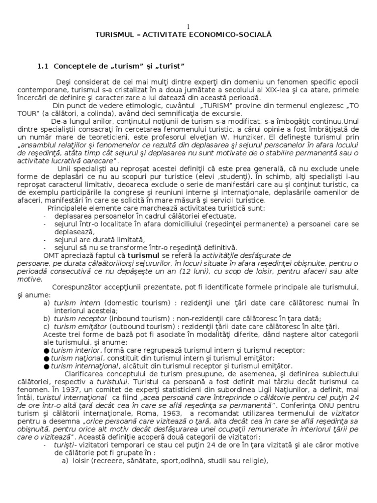 1.1 Conceptele de turism i turist Dei considerat de cei mai muli dintre experi din domeniu un fenomen specific epocii contemporane, turismul s-a cristalizat n a doua jumtate a secolului al XIX-lea i ca atare, primele ncercri de definire i caracterizare a lui dateaz din aceast perioad. Din punct de vedere etimologic, cuvntul TURISM provine din termenul englezesc TO TOUR (a cltori, a colinda), avnd deci semnificaia de excursie. De-a lungul anilor, coninutul noiunii de turism s-a modificat, s-a mbogit [Link] dintre specialitii consacrai n cercetarea fenomenului turistic, a crui opinie a fost mbriat de un numr mare de teoreticieni, este profesorul elveian W. Hunziker. El definete turismul prin ansamblul relaiilor i fenomenelor ce rezult din deplasarea i sejurul persoanelor n afara locului de reedin, atta timp ct sejurul i deplasarea nu sunt motivate de o stabilire permanent sau o activitate lucrativ oarecare. Unii specialiti au reproat acestei definiii c este prea general, c nu exclude unele forme de deplasri ce nu au scopuri pur turistice (elevi ,studeni). n schimb, ali specialiti i-au reproat caracterul limitativ, deoareca exclude o serie de manifestri care au i coninut turistic, ca de exemplu participrile la congrese i reuniuni interne i internaionale, deplasrile oamenilor de afaceri, manifestri n care se solicit n mare msur i servicii turistice. Principalele elemente care marcheaz activitatea turistic sunt: - deplasarea persoanelor n cadrul cltoriei efectuate, - sejurul ntr-o localitate n afara domiciliului (reedinei permanente) a persoanei care se deplaseaz, - sejurul are durat limitat, - sejurul s nu se transforme ntr-o reedin definitiv. OMT apreciaz faptul c turismul se refer la activitile desfurate de persoane, pe durata clatoriilori sejururilor, n locuri situate n afara reedinei obinuite, pentru o perioad consecutiv ce nu depete un an (12 luni), cu scop de loisir, pentru afaceri sau alte motive. Corespunztor accepiunii prezentate, pot fi identificate formele principale ale turismului, i anume: a) turism intern (domestic tourism) : rezidenii unei ri date care cltoresc numai n interiorul acesteia; b) turism receptor (inbound tourism) : non-rezidenii care cltoresc n ara dat; c) turism emitor (outbound tourism) : rezidenii rii date care cltoresc n alte ri. Aceste trei forme de baz pot fi asociate n modaliti diferite, dnd natere altor categorii ale turismului, i anume: turism interior, form care regrupeaz turismul intern i turismul receptor; turism naional, constituit din turismul intern i turismul emitor; turism internaional, alctuit din turismul receptor i turismul emitor. Clarificarea conceptului de turism presupune, de asemenea, i definirea subiectului cltoriei, respectiv a turistului. Turistul ca persoan a fost definit mai trziu dect turismul ca fenomen. n 1937, un comitet de experi statisticieni din subordinea Ligii Naiunilor, a definit, mai nti, turistul internaional ca fiind acea persoan care ntreprinde o cltorie pentru cel puin 24 de ore ntr-o alt ar dect cea n care se afl reedina sa permanent . Conferina ONU pentru turism i cltorii internaionale, Roma, 1963, a recomandat utilizarea termenului de vizitator pentru a desemna orice persoan care viziteaz o ar, alta dect cea n care se afl reedina sa obinuit, pentru orice alt motiv dect desfurarea unei ocupaii remunerate n interiorul rii pe care o viziteaz. Aceast definiie acoper dou categorii de vizitatori: - turiti- vizitatori temporari ce stau cel puin 24 de ore n ara vizitat i ale cror motive de cltorie pot fi grupate n : a) loisir (recreere, sntate, sport,odihn, studii sau religie),