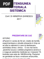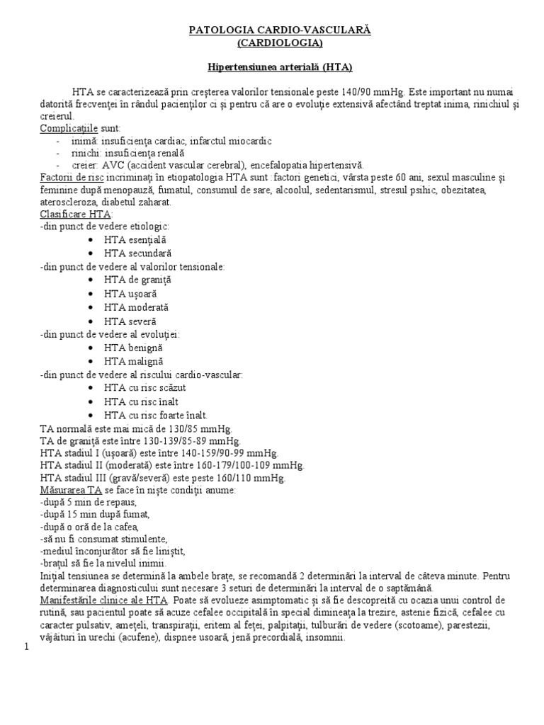 Este important nu numai datorit frecvenei n rndul pacienilor ci i pentru c are o evoluie extensiv afectnd treptat inima, rinichiul i creierul. Complicaiile sunt: - inim: insuficiena cardiac, infarctul miocardic - rinichi: insuficiena renal - creier: AVC (accident vascular cerebral), encefalopatia hipertensiv. Factorii de risc incriminai n etiopatologia HTA sunt :factori genetici, vrsta peste 60 ani, sexul masculine i feminine dup menopauz, fumatul, consumul de sare, alcoolul, sedentarismul, stresul psihic, obezitatea, ateroscleroza, diabetul zaharat. Clasificare HTA: -din punct de vedere etiologic: HTA esenial HTA secundar -din punct de vedere al valorilor tensionale: HTA de grani HTA uoar HTA moderat HTA sever -din punct de vedere al evoluiei: HTA benign HTA malign -din punct de vedere al riscului cardio-vascular: HTA cu risc sczut HTA cu risc nalt HTA cu risc foarte nalt. TA normal este mai mic de 130/85 mmHg. TA de grani este ntre 130-139/85-89 mmHg. HTA stadiul I (uoar) este ntre 140-159/90-99 mmHg. HTA stadiul II (moderat) este ntre 160-179/100-109 mmHg. HTA stadiul III (grav/sever) este peste 160/110 mmHg. Msurarea TA se face n nite condiii anume: -dup 5 min de repaus, -dup 15 min dup fumat, -dup o or de la cafea, -s nu fi consumat stimulente, -mediul nconjurtor s fie linitit, -braul s fie la nivelul inimii. Iniial tensiunea se determin la ambele brae, se recomand 2 determinri la interval de cteva minute. Pentru determinarea diagnosticului sunt necesare 3 seturi de determinri la interval de o saptmn. Manifestrile clinice ale HTA. Poate s evolueze asimptomatic i s fie descopreit cu ocazia unui control de rutin, sau pacientul poate s acuze cefalee occipital n special dimineaa la trezire, astenie fizic, cefalee cu caracter pulsativ, ameeli, transpiraii, eritem al feei, palpitaii, tulburri de vedere (scotoame), parestezii, vjituri n urechi (acufene), dispnee usoar, jen precordial, insomnii.