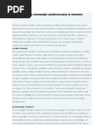 Infarctul miocardic Infarctul miocardic este o zon de necroz ischemic produs prin obliterarea unei ramuri coronariene. Factori favorizani hipertensiunea arterial, diabetul zaharat, obezitatea, fumatul, stresul, sedentarismul, hiperlipemia. Factori declanatori efot, mese copioase, stres Semne clinice durerea este retrosternal sau precordial. S-au descris mai multe caractere ale durerii : senzaie de constricie sau n gheara, senzaie de presiune, uneori simpla jen retrosternal, senzaie de arsur, de greutate sau de [Link] ieadiaz n umrul stng, n regiunea cervical i n regiunea mandibular. Mai poate fi localizat extratoracic, n epigastru, abdomen, brae. Durata durerii poate fi de 30 min pn la 48 ore. Nu cedeaz la nitrii, apare de obicei n repaus, poate fi nsoit de anxietate ectrem, senzaie de moarte, grea, vrsturi, distensie abdominal cu transpiraii reci, adinamie, astenie i ameeli. Conduita de urgen: -aezarea pacientului n decubit dorsal i interzicerea efecturii oricrei micri -sedarea durerii : morfin, mialgin, fortral, algocalmin; MONA (morfin, oxigenoterapie, nitroglicerin, aspirin) Atenie la morfin pentru c poate provoca hipotensiunearterial. Este important pn la ajungerea intr-o unitate specializat supravegherea funciilor vitale. Se efectueaz electrocardiogram, se monitorizeaz TA i ritmul cardiac. Insuficiena cardiac Insuficiena cardiac este determinat de incapacitatea inimii de a prelua i de a trimite n arborele circulator cantitatea de snge care s acopere nevoile metabolice ale organismului. Este de cele mai multe ori stadiul final al multor boli cardiace. Cauzele care duc la apariia insuficienei cardiace pot aciona: -prin supra solicitarea miocardului, aa cum se ntmpl n HTA, stenoza aortic sau insuficiena mitral -prin afectarea contractivitii miocardului, aa cum se ntmpl n cardiopatia ischemic, miocardite, etc. Clasificarea insuficienei cardiace: -n funcie de ventriculul interesat : * insuficien cardiac stng * insuficien cardiac dreapt * insuficien cardiac global -clasificarea NYHA (New York Heart Association) *clasa I : dispnee la eforturi foarte mari (urcatul a 10 trepte cu o greutate mai mare de 10 kg) *clasa II : dispnee la eforturi obinuite (mersul plat, grdinritul) *clasa III : dispnee la eforturi mici (mbrcat, mersul lent) *clasa IV : dispnee de repaus (chiar i n repaus la pat) n clasa I pacientul este asimptomatic, n clasa II poate fi simptomatic, n clasa III este simptomatic cu dispnee de repaus de dat recent, n clasa IV este simptomatic cu dispnee de repaus. Manifestri [Link] n funcie de ventriculul interesat i de aceea din punct de vedere clinic vorbim de o insuficien cardiac stng, insuficien cardiac dreapt, insuficien cardiac global. -Insuficiena cardiac stng are ca simptom dominant dispneea, care iniial este dispnee de efort i cu timpu devine dispnee de repaus sub form de ortopnee. Iar apoi se poate manifesta sub form de dispnee paroxistic (aprut brusc) sau chiar edem pulmonar. Pe lng dispnee mai poate aprea tusea (seac i nocturn predominent), astenia i fatigabilitatea. -Insuficiena cardiac dreapt se caracterizeaz prin semne de staz sistemic, astfel putem ntlni o hepatalgie, cianoz, edeme declive, reflux hepatojugular. -Insuficiena cardiac global de cele mai multe ori este rezultatul cedrii i a celuilalt ventricul.