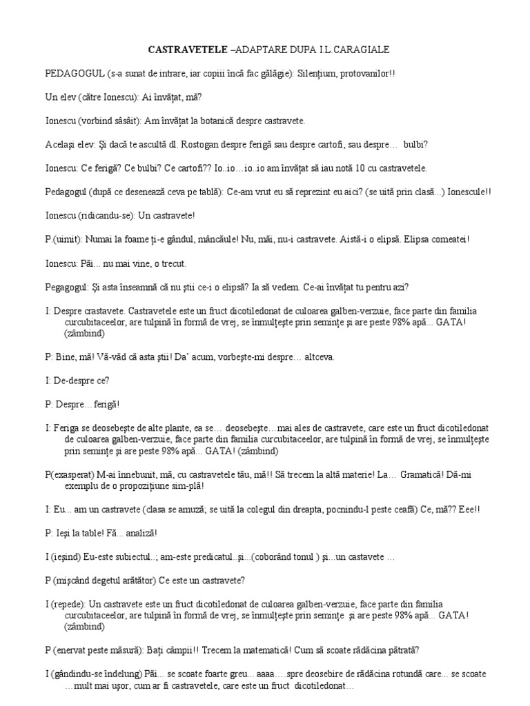 Un elev (ctre Ionescu): Ai nvat, m? Ionescu (vorbind ssit): Am nvat la botanic despre castravete. Acelai elev: i dac te ascult dl. Rostogan despre ferig sau despre cartofi, sau despre bulbi? Ionescu: Ce ferig? Ce bulbi? Ce cartofi?? Io..ioio..io am nvat s iau not 10 cu castravetele. Pedagogul (dup ce deseneaz ceva pe tabl): Ce-am vrut eu s reprezint eu aici? (se uit prin clas...) Ionescule!! Ionescu (ridicandu-se): Un castravete! P.(uimit): Numai la foame i-e gndul, mncule! Nu, mi, nu-i castravete. Aist-i o elips. Elipsa comeatei! Ionescu: Pi... nu mai vine, o trecut. Pegagogul: i asta nseamn c nu tii ce-i o elips? Ia s vedem. Ce-ai nvat tu pentru azi? I: Despre crastavete. Castravetele este un fruct dicotiledonat de culoarea galben-verzuie, face parte din familia curcubitaceelor, are tulpin n form de vrej, se nmulete prin semine i are peste 98% ap... GATA! (zmbind) P: Bine, m! V-vd c asta tii! Da acum, vorbete-mi despre altceva. I: De-despre ce? P: Despreferig! I: Feriga se deosebete de alte plante, ea se deosebetemai ales de castravete, care este un fruct dicotiledonat de culoarea galben-verzuie, face parte din familia curcubitaceelor, are tulpin n form de vrej, se nmulete prin semine i are peste 98% ap... GATA! (zmbind) P(exasperat) M-ai nnebunit, m, cu castravetele tu, m!! S trecem la alt materie! La Gramatic! D-mi exemplu de o propoziiune sim-pl! I: Eu... am un castravete (clasa se amuz; se uit la colegul din dreapta, pocnindu-l peste ceaf) Ce, m?? Eee!! P: Iei la table! F... analiz! I (ieind) Eu-este subiectul..; am-este predicatul..i...(cobornd tonul ) i...un castavete P (micnd degetul arttor) Ce este un castravete? I (repede): Un castravete este un fruct dicotiledonat de culoarea galben-verzuie, face parte din familia curcubitaceelor, are tulpin n form de vrej, se nmulete prin semine i are peste 98% ap... GATA! (zmbind) P (enervat peste msur): Bai cmpii!! Trecem la matematic! Cum s scoate rdcina ptrat? I (gndindu-se ndelung) Pi... se scoate foarte greu... [Link] deosebire de rdcina rotund care... se scoate mult mai uor, cum ar fi castravetele, care este un fruct dicotiledonat 1